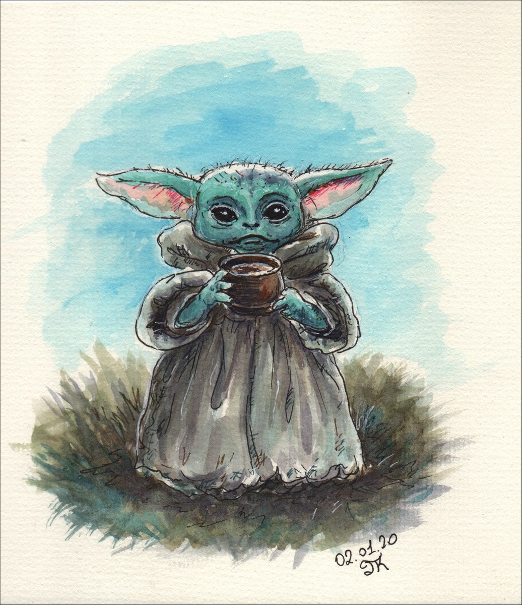 Из всех новых сериалов франшизы ЗВ мне больше всего понравился "Мандалорец". Так что по горячим следам нарисовала в свое время малыша Грогу. С супом.
