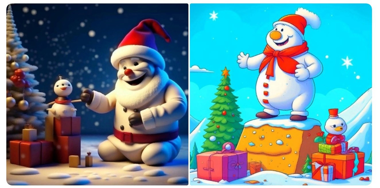 РЕАЛЬНОСТЬ: Снеговик в образе с красной шапкой вручает подарок(держит за руку) другого, маленького, трехшарового человечка, сидящему на горе подарков под ёлкой.