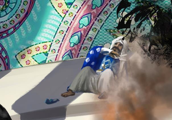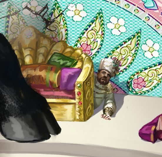 По знаку эмира слуги внесли в зал треножник, на котором стояла жаровня с углями. Ещё двое слуг принесли чёрного петуха. Петух вращал глазами, но не вырывался, так как крылья и лапы у него были крепко связаны.