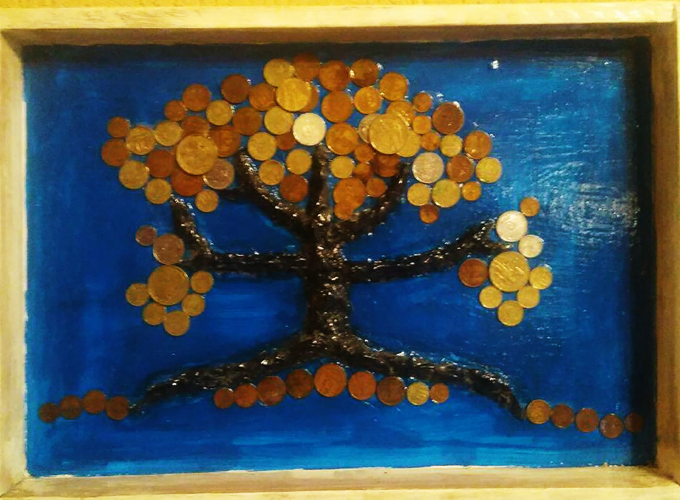 Инсталляция. Разиер 40х50. Использовались монеты четырех стран. Среди них имеются и редкие образцы. Продается.