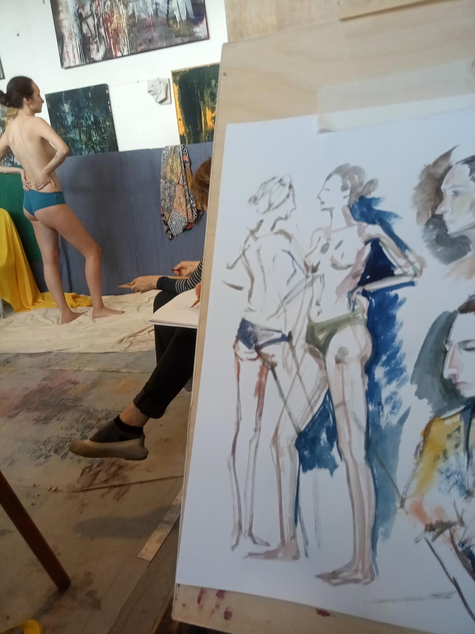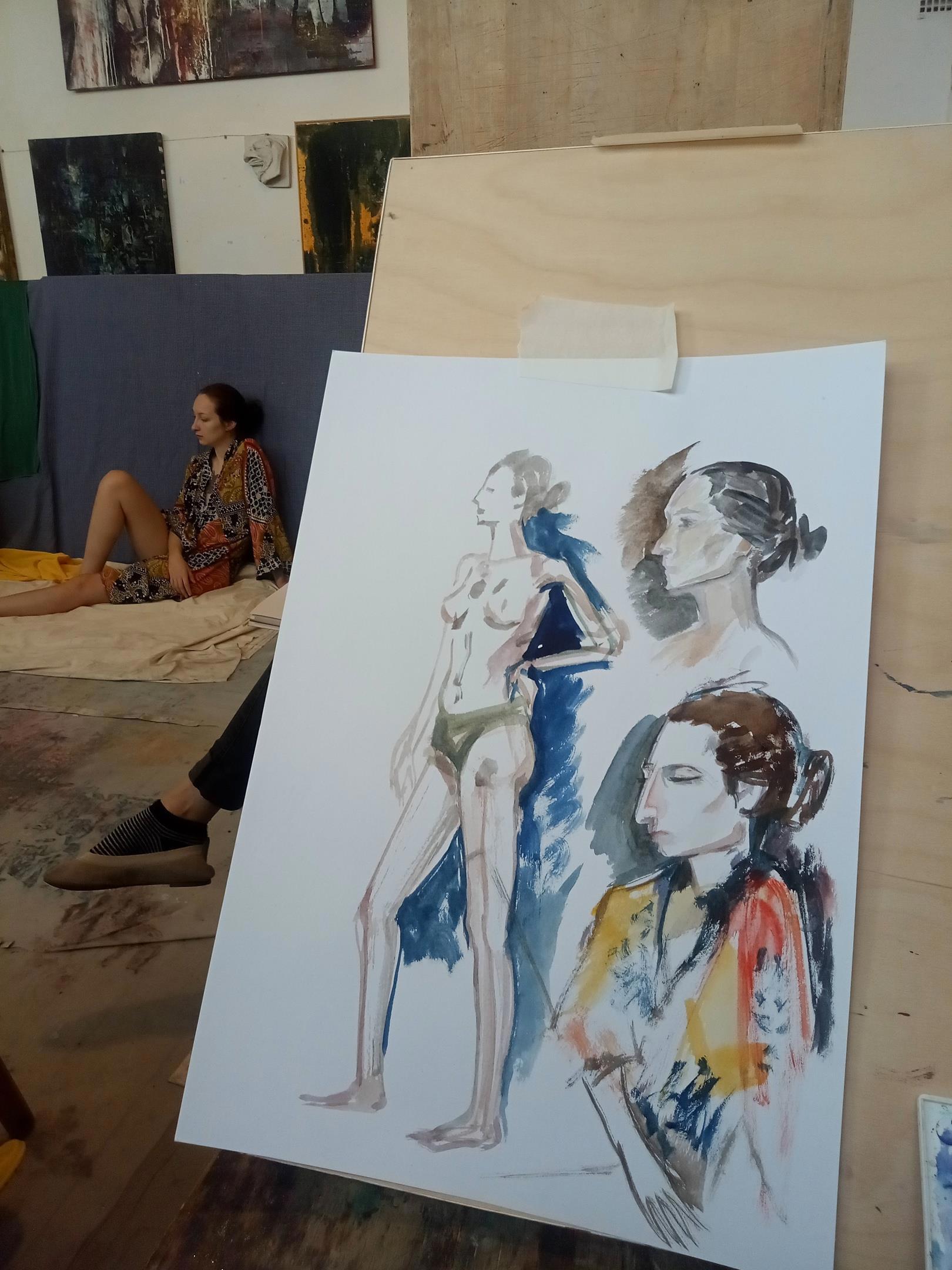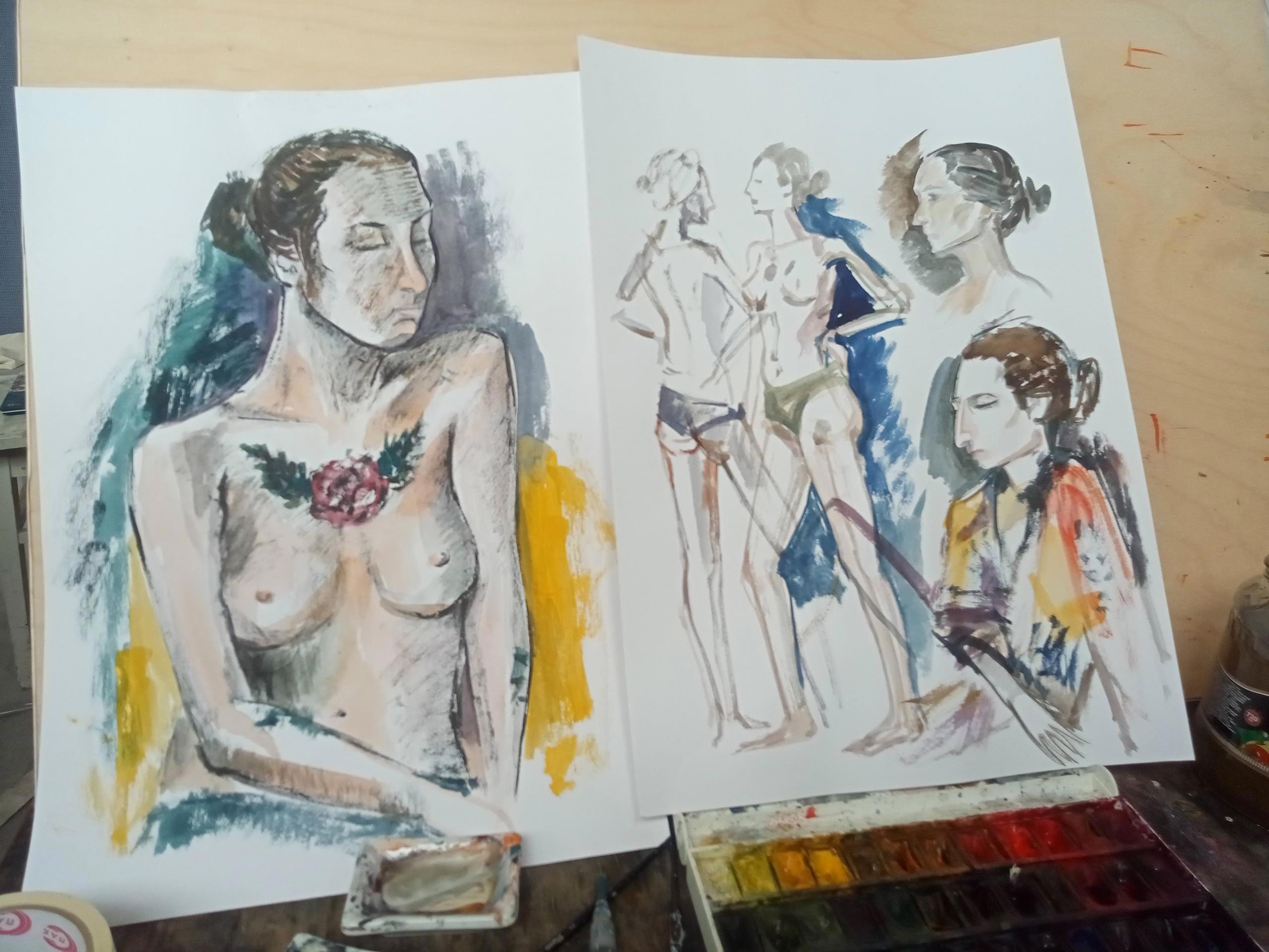 Это сразу несколько 15-минутных зарисовок модели на одном листе акварелью.