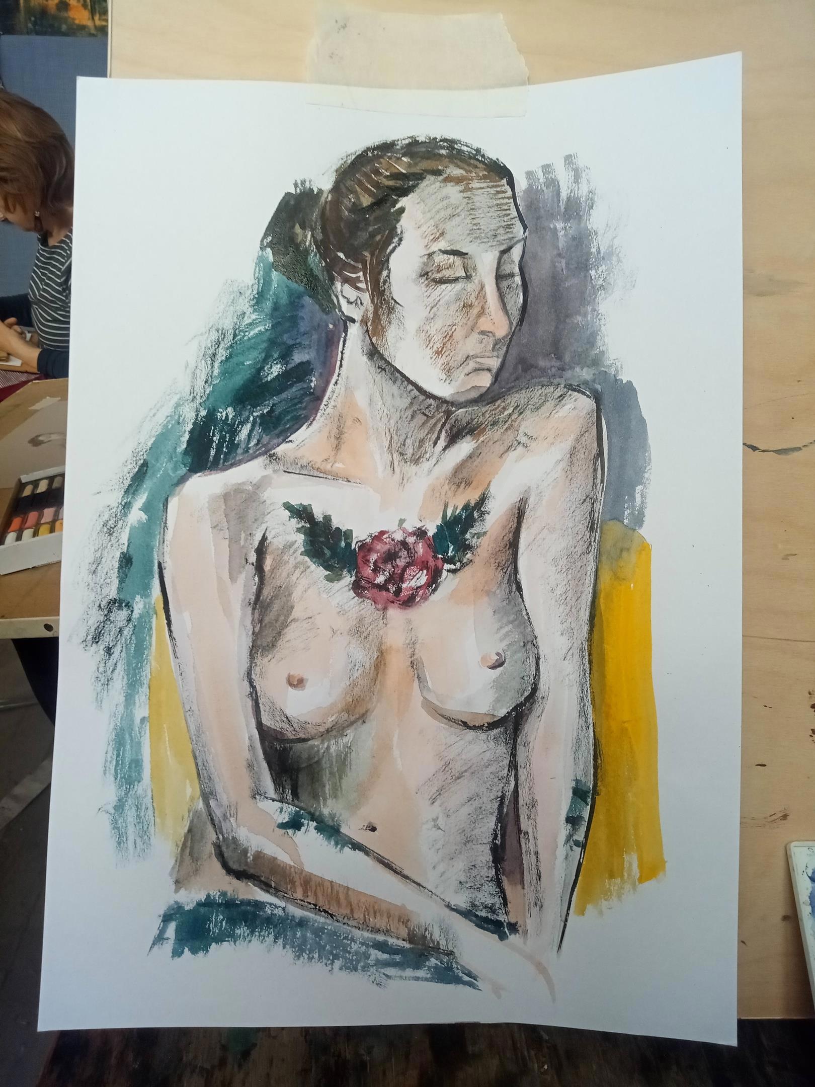 Часовая постановка. Модель сидела ко мне в не очень хорошем ракурсе, чтобы рисовать полностью, так что ограничилась видом до пояса