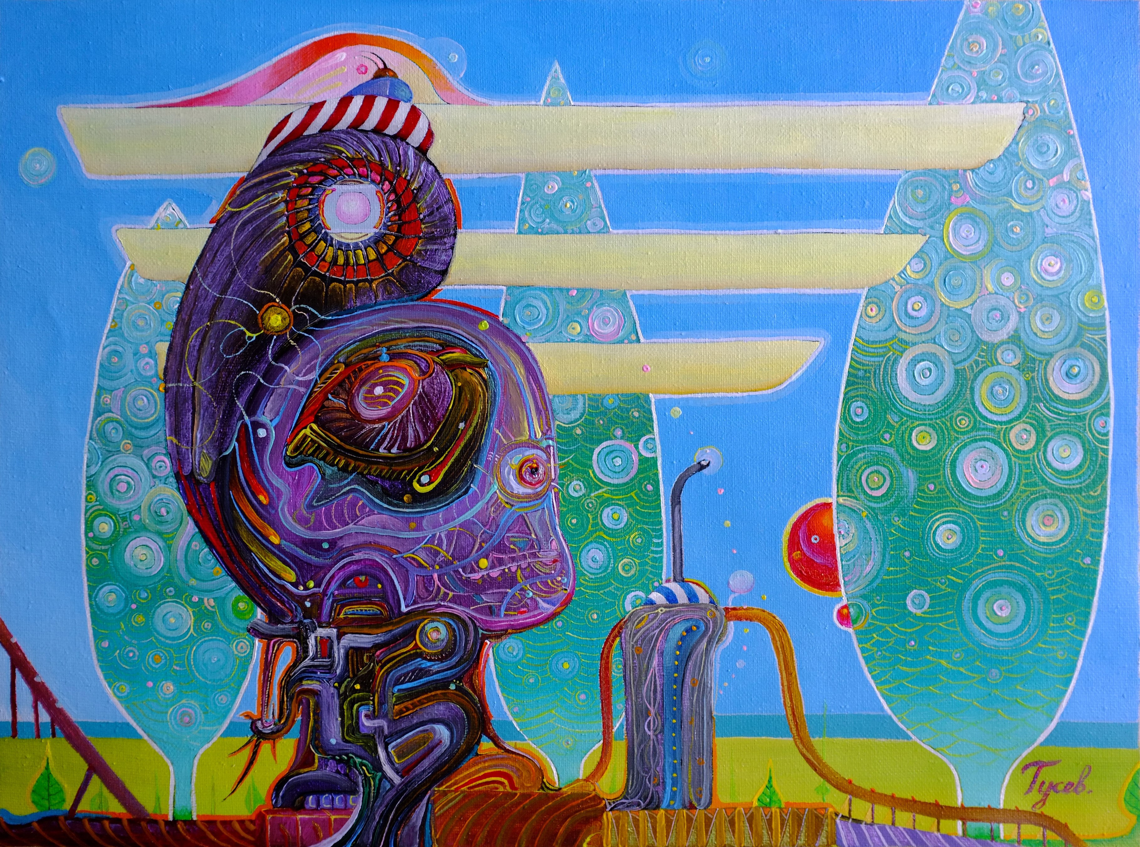 У правой руки есть левая рука, между ними расстояние больше-меньше ноги, чтобы посмотреть, как шевелится и растёт трава над дном реки, с падающим снегом, стирающим шаги. Речка течёт даже внутри гипер-гипермаркета под стеклянной крышей, потолки укрыты снегом, вспоминается слово "тинктура" - название красок и покрытий в геральдике всего, всех игр, спортивных, карточных, шашек-шахмат, каких угодно, буквально, подробно. И ещё спросишь себя, в чём смысл и глубина, да и сам себе на пальцах же и объяснишь. Это же не приснившийся - сам себе сон - про то, как речка вытекает из небольшого, семьдесят на тридцать метров, аккуратного, с камышами и кочками, болота. Протекает, затем исчезает под Кольцевой и оказывается на территории Москвы. Везде, где она появляется на поверхности её долина благоустроена, но большей частью течение её происходит в трубах, иногда очень глубоко под землёй. А посреди того болотца из которого берёт она своё начало есть небольшой холмик-островок, "кабошон", и там что-то есть... "У правой руки" холст/масло 30 х 40 см серия "Линия любви" фрагмент 1к