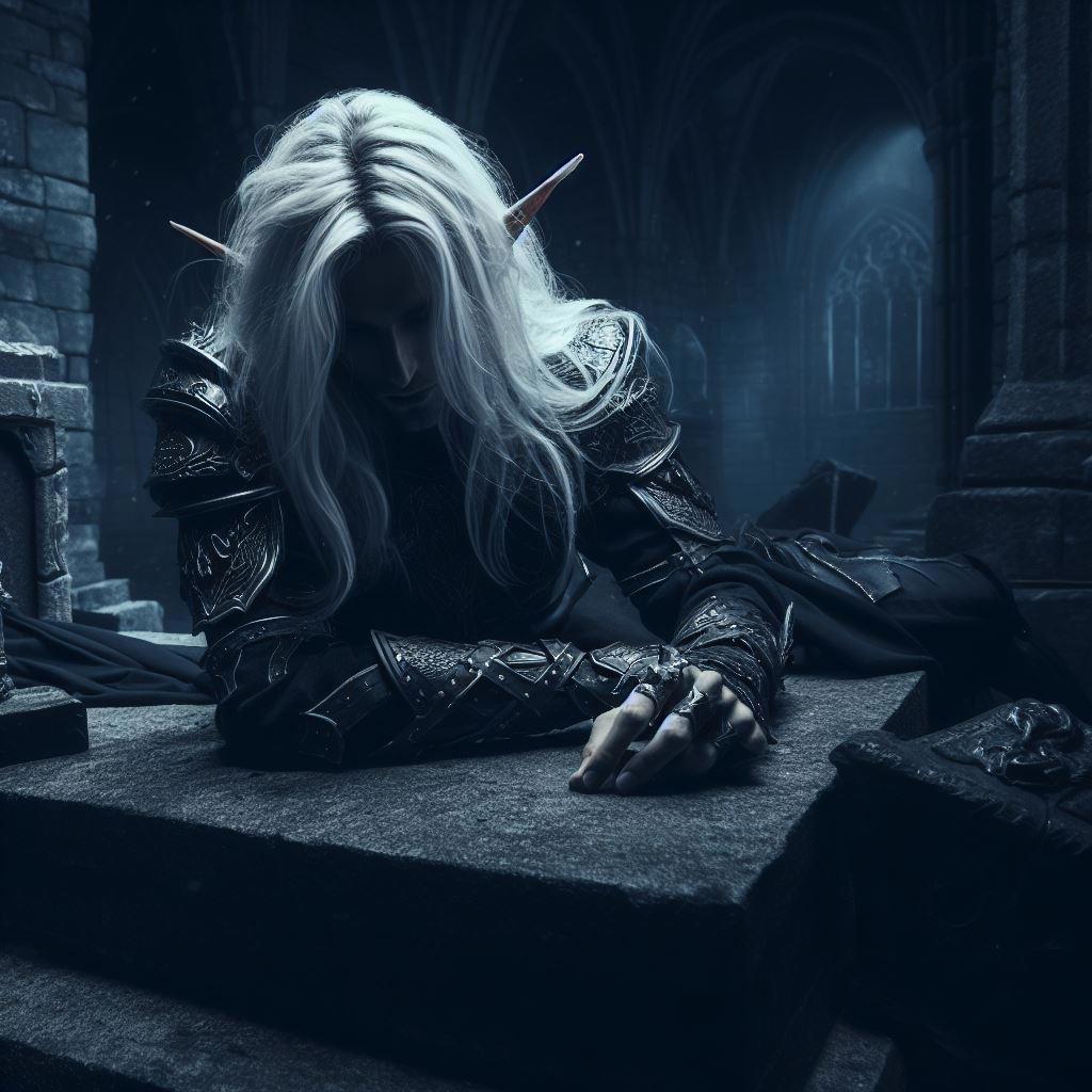 Раненый Сорнтран на таинственном алтаре. Иллюстрации к главе {21} "Госпожи Шестого Дома", созданные нейросетью.