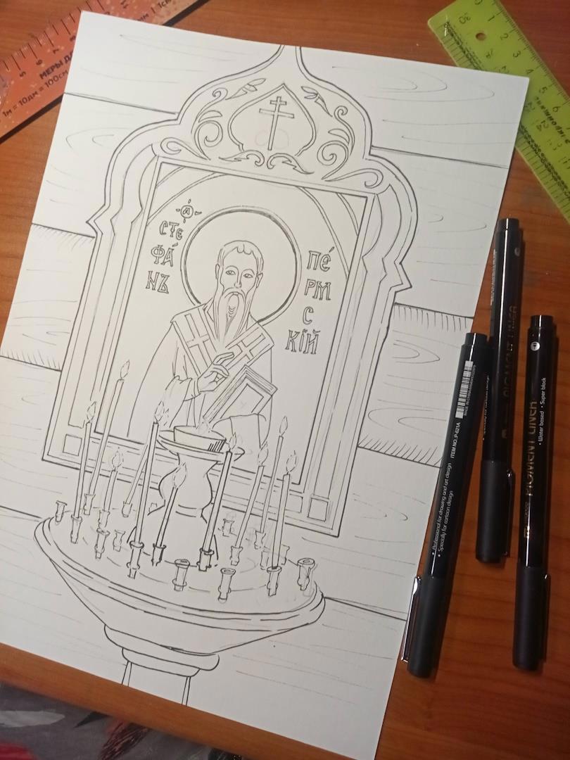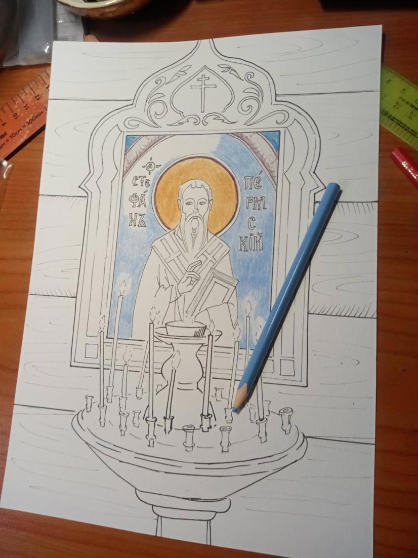 Ещё одна иллюстрация для моей детской книги "Пармские сказы для самых маленьких", нарисованная пастельными и акварельными карандашами. Икона со Стефаном Пермским.