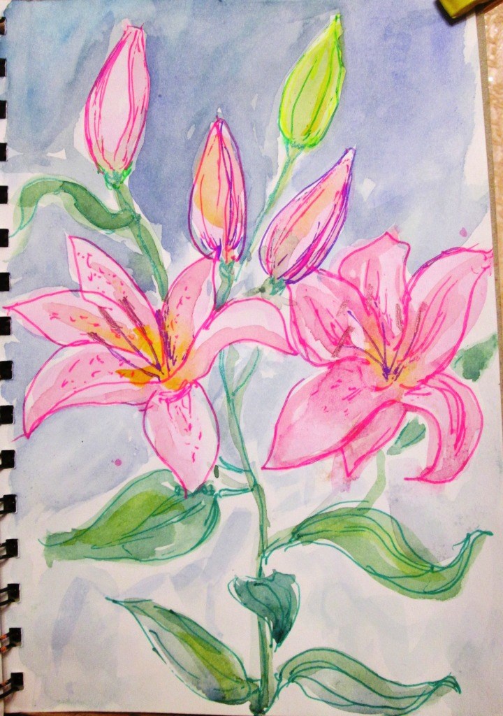 розовые лилии Автор: Елена Матеуш скетч. акварель + гелиевые ручки скетч, цветы, акварель 433 Пожаловаться