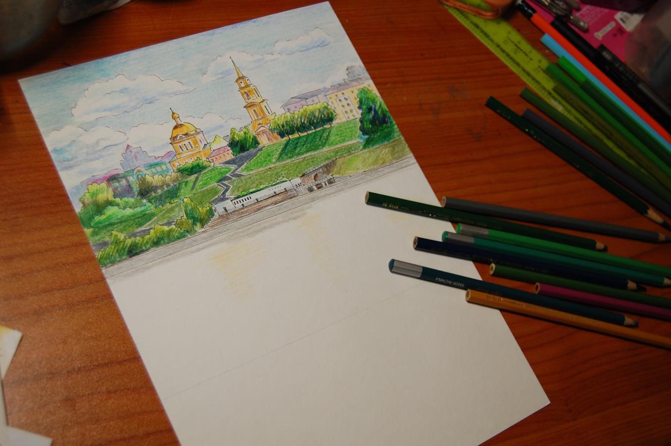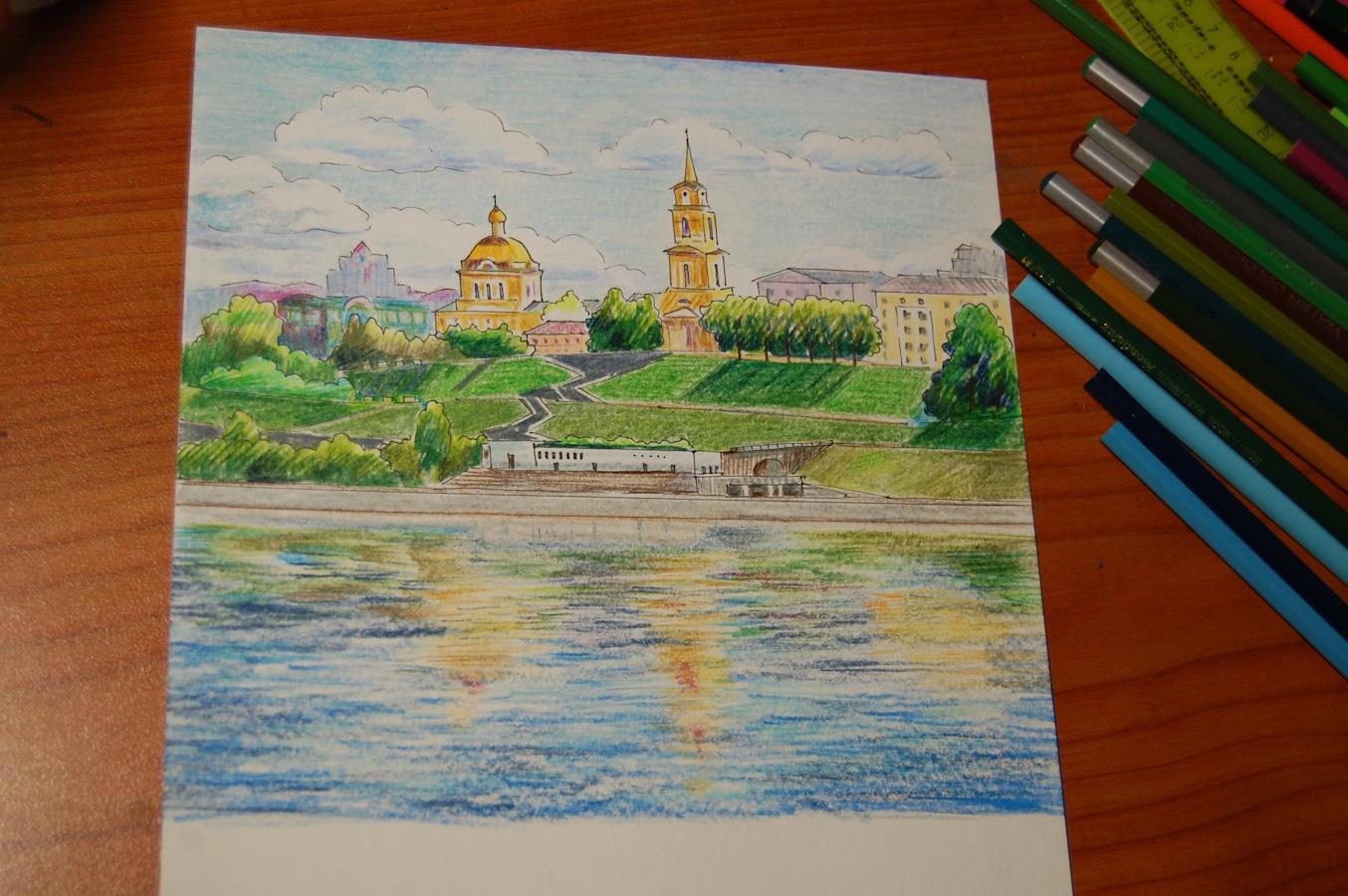 Это ещё одна моя иллюстрация пастельными и акварельными карандашами для моей детской книжки "Пармские сказы". Вид на Пермь с реки Кама, которая протекает не только по городу, но и соединяет очень много городов Пермского края водными путями