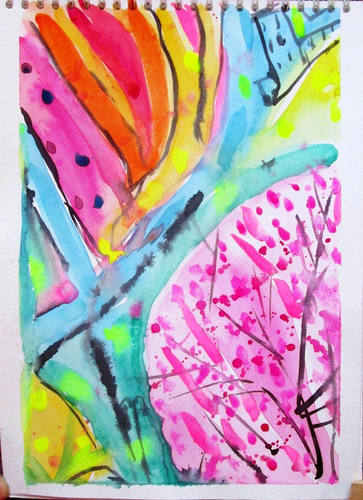 В проекте Ирины Лакото "Твори просто круглый год" знакомились с творчеством Василия Кандинского. Заданием для нас было попробовать создать акварельную абстракцию. Абстракции мне даются плохо, но тут делала с удовольствием. В голове при этом надо держать конкретную тему, которую хочешь изобразить, но сделать это надо через цвет, пятна, линию без конкретики. У нас в городе весной красиво цветут кусты сакуры. Пока ещё этого нет, но уже предвкушаю.