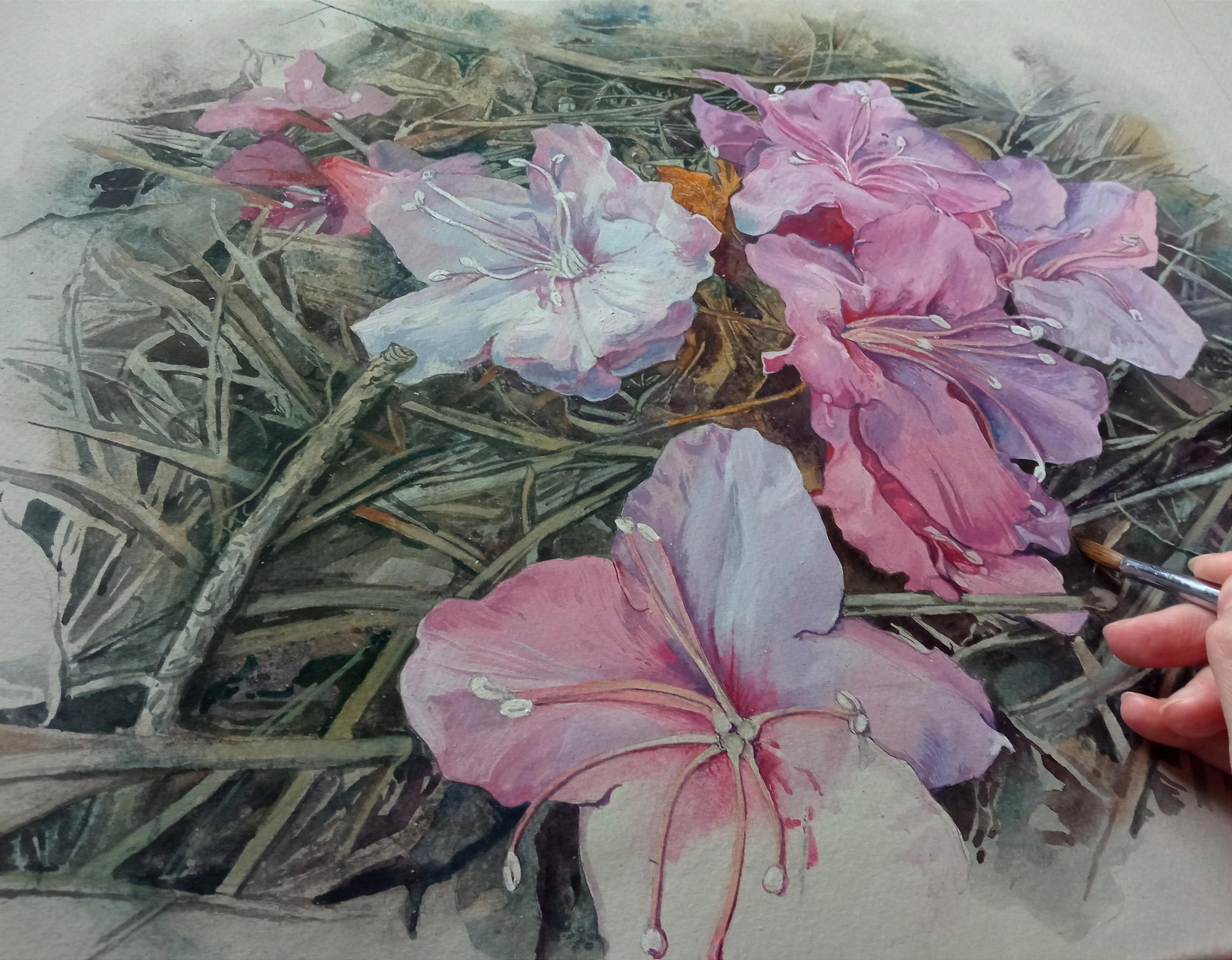 Небольшая зарисовка опавших цветов рододендрона в смешанной технике)