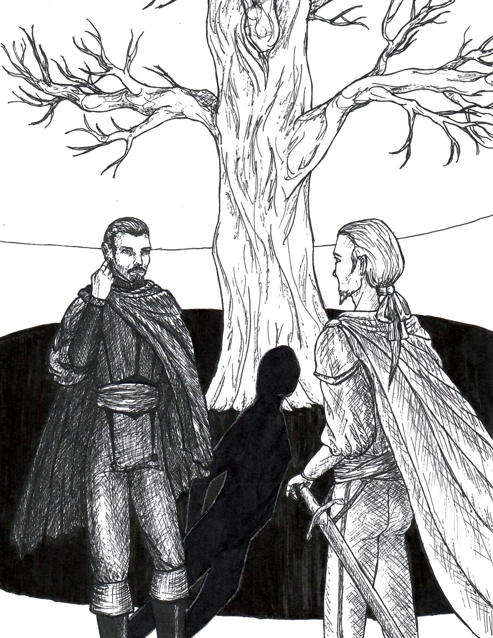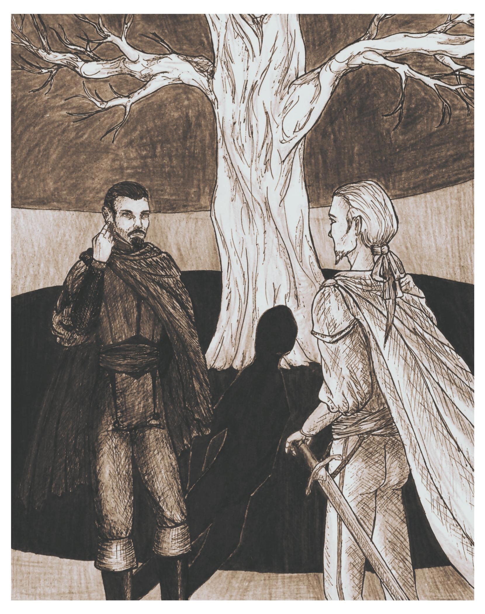 Костяной дуб, белый, выделяющийся на фоне. Темно-фиолетового ночного неба - купола. Неожиданная и напряжённая встреча. Традиционное приветствие - коснуться мочки уха, своевольная живая тень. Красный амулет на груди белого стража. Богатые, но потрепанные одежды второго. Много испано-звучащих имён и названий, поэтому такая стилистика одежды. И особый выжженный круг вокруг дерева, в который заходить опасно для жизни.