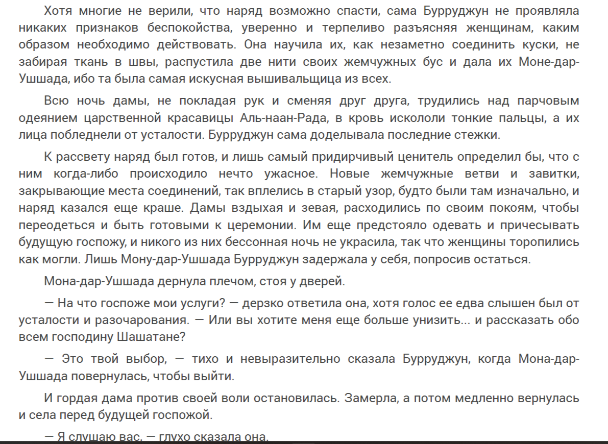 Что здесь происходит: Мона-дар-Ушшада считала, что именно она должна быть женой правителя, и от той боли, которое причиняет ей выбранная на смотринах Бурруджун, она подговорила подруг разорвать подвенечный наряд. Бурруджун многое могла бы сделать. Но она выбирает собрать всех своих придворных девушек и всю ночь сшивать разорванный наряд при помощи драгоценных ожерелий. Осталась вместе с ними и работала наравне, а Мона-дар-Ушшада больше всех. Ох, как же я люблю мудрую Бурруджун, с какой радостью я всегда возвращаюсь к ней! Книга здесь.