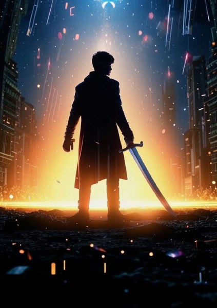 - главный герой Слава, 22 года, стоит спиной зрителю посреди Московской улицы, на нём мантия волшебника, в руках Слава держит меч, вокруг - атмосфера войны и тревоги