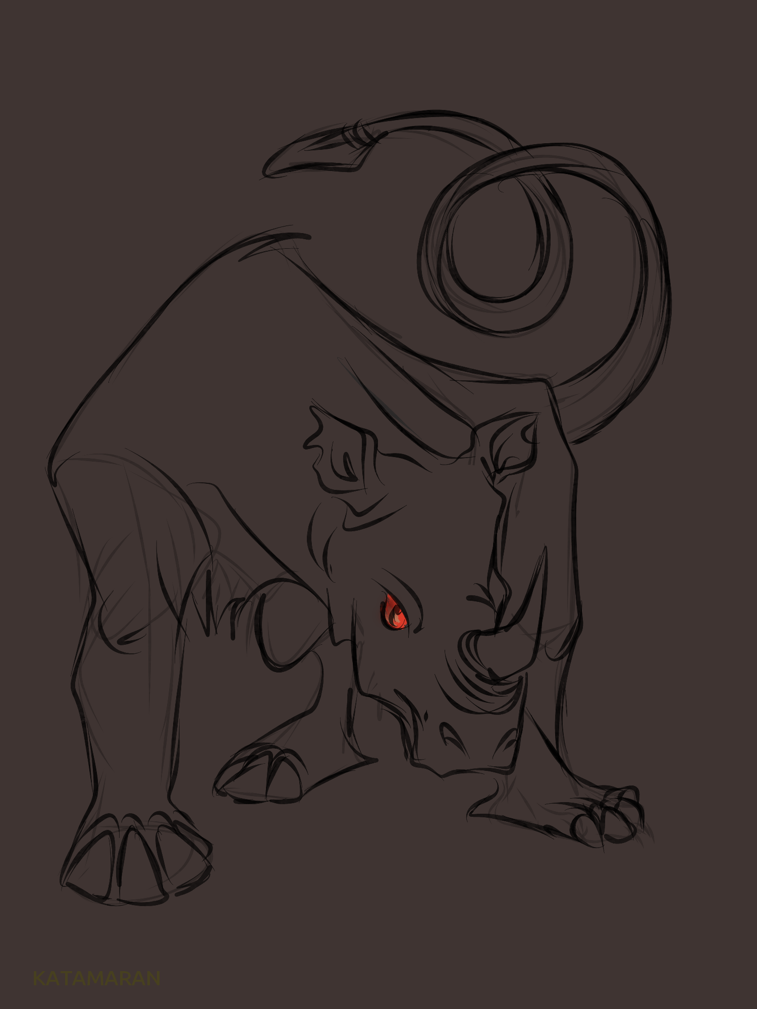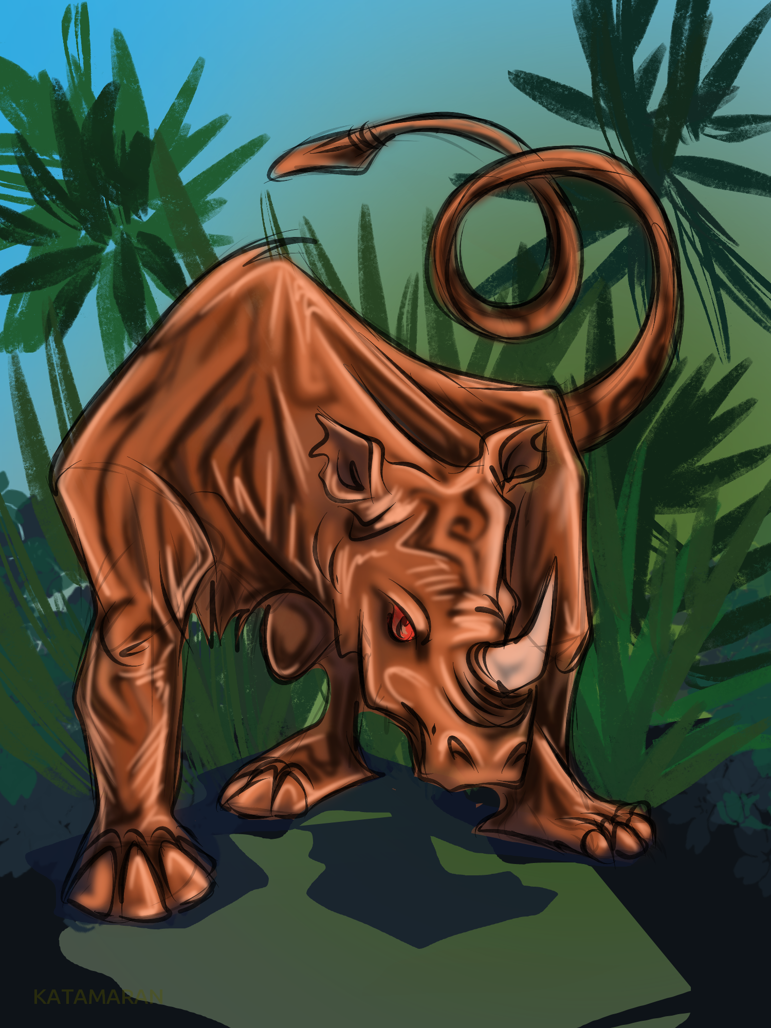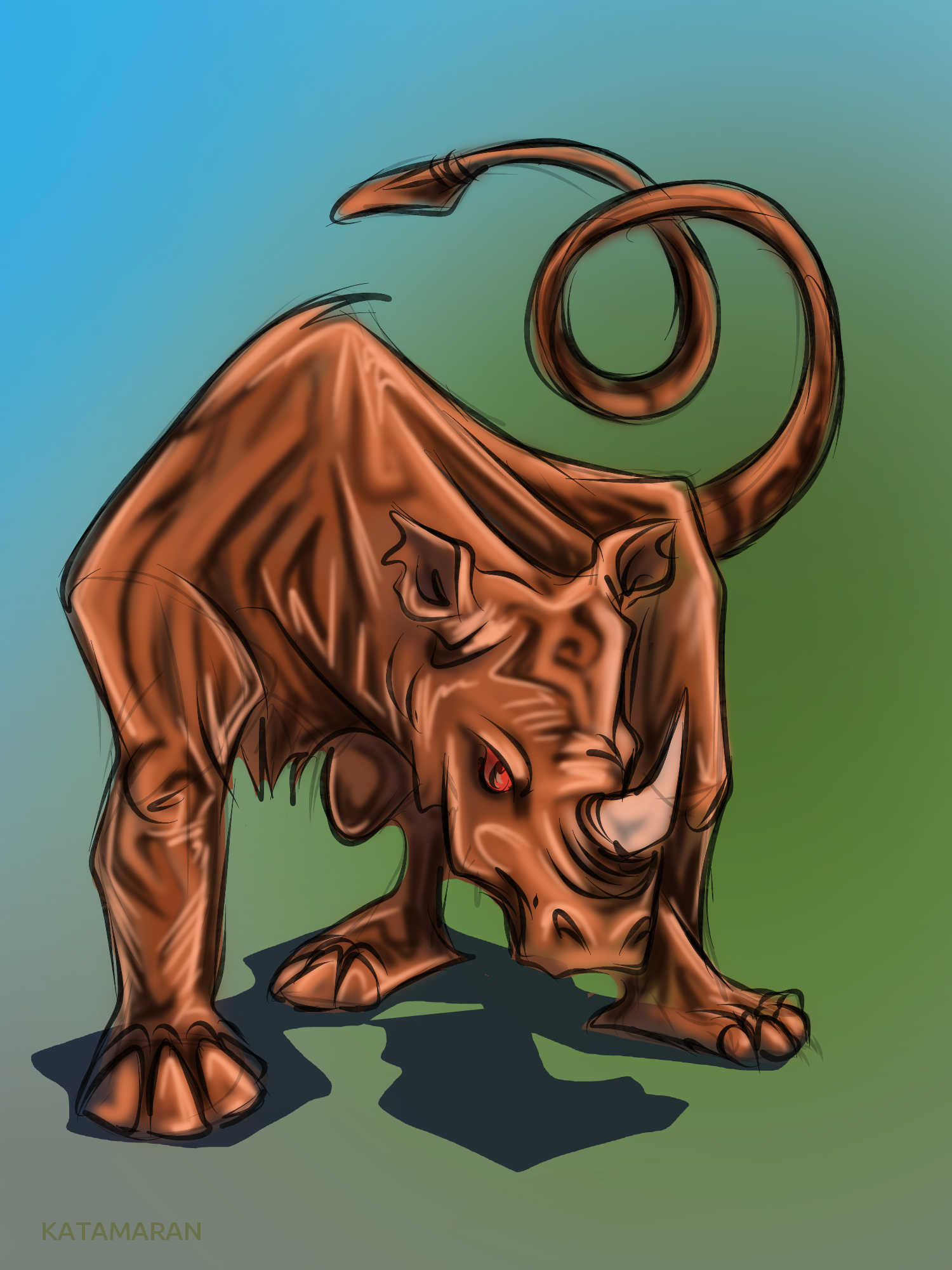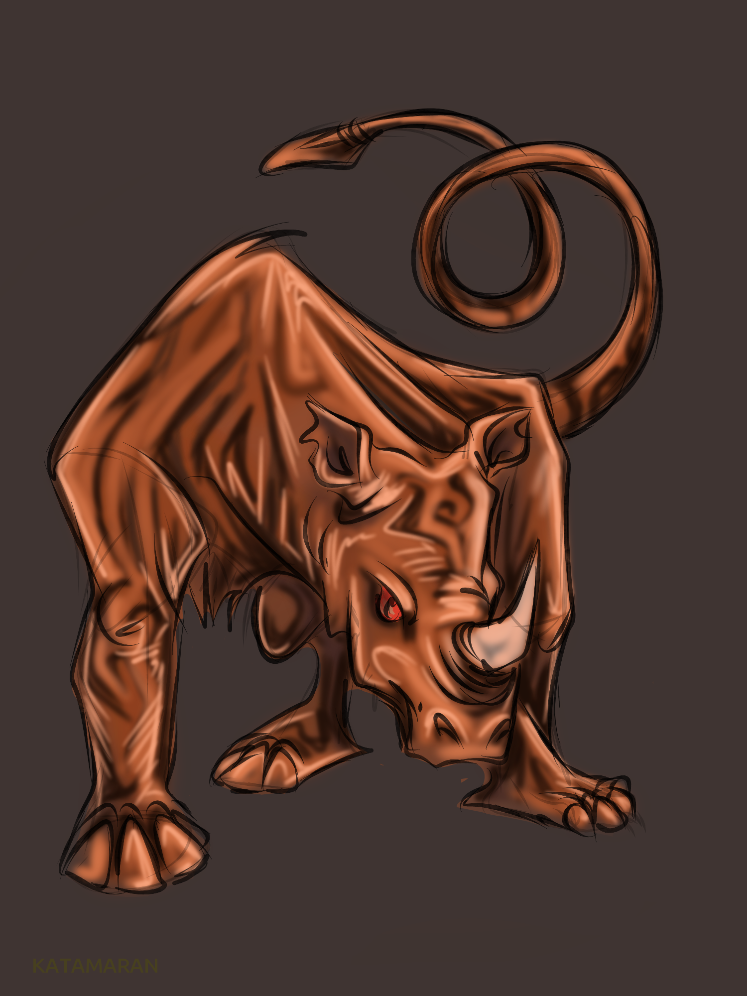 Да, он увлекся своей пламенной речью, но не настолько же, чтобы не услышать топот этих массивных лап, вооруженных длинными и острыми когтями. Или же тварь умела ходить бесшумно, и только случайность в виде хрустнувшей ветки позволила Аджиту обратить на существо внимание? Но, посмотрев чудовищу прямо в его красные, словно кровь, глаза командир понял — все было проще. Он не знал, откуда возникла у него такая уверенность... не мог ее объяснить — существо хотело, чтобы его обнаружили. Синхаподобный носорог, или кто он там на самом деле, не собирался нападать исподтишка, будто стая шакалов. Уверенное в собственном превосходстве, оно возвышалось над ним на добрых две головы. Слегка вытянутую морду на длинной шее венчал смертоносный рог. Крепкое, мускулистое тело покрывала плотная коричневая чешуя.