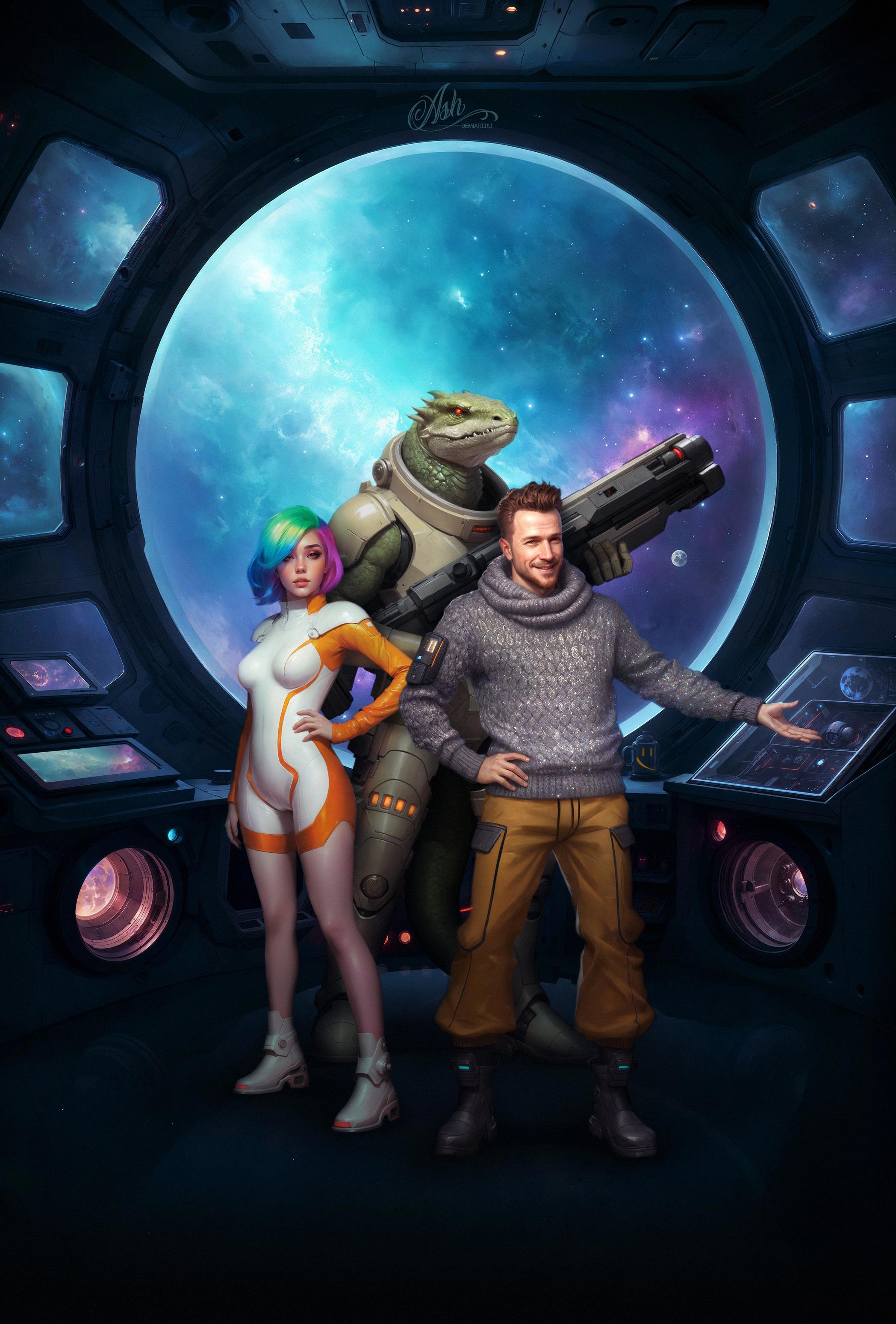 На обложке изображены: Одиссей Фокс (главный герой), Афина и Трайбер — команда корабля «Мусорог».