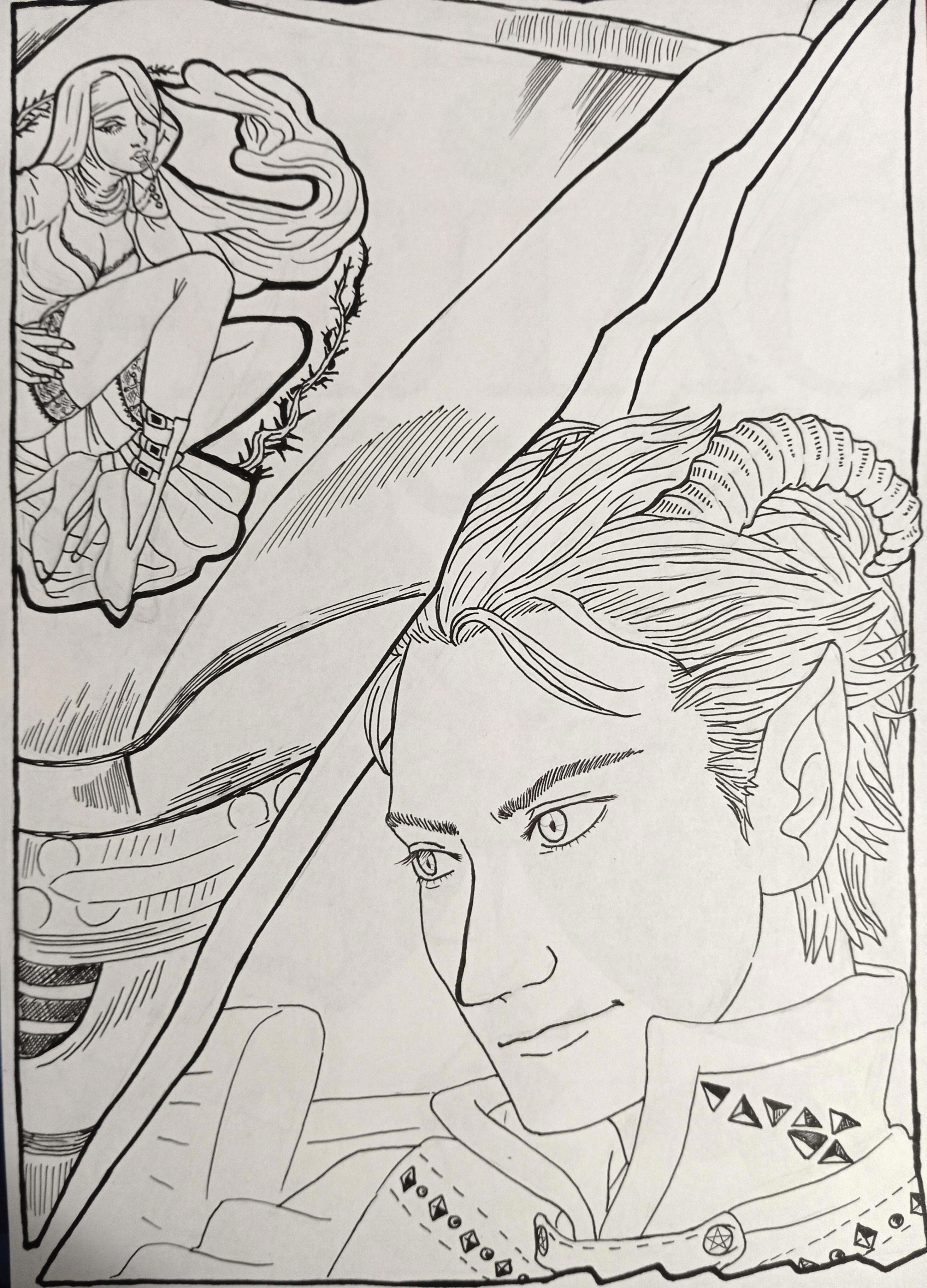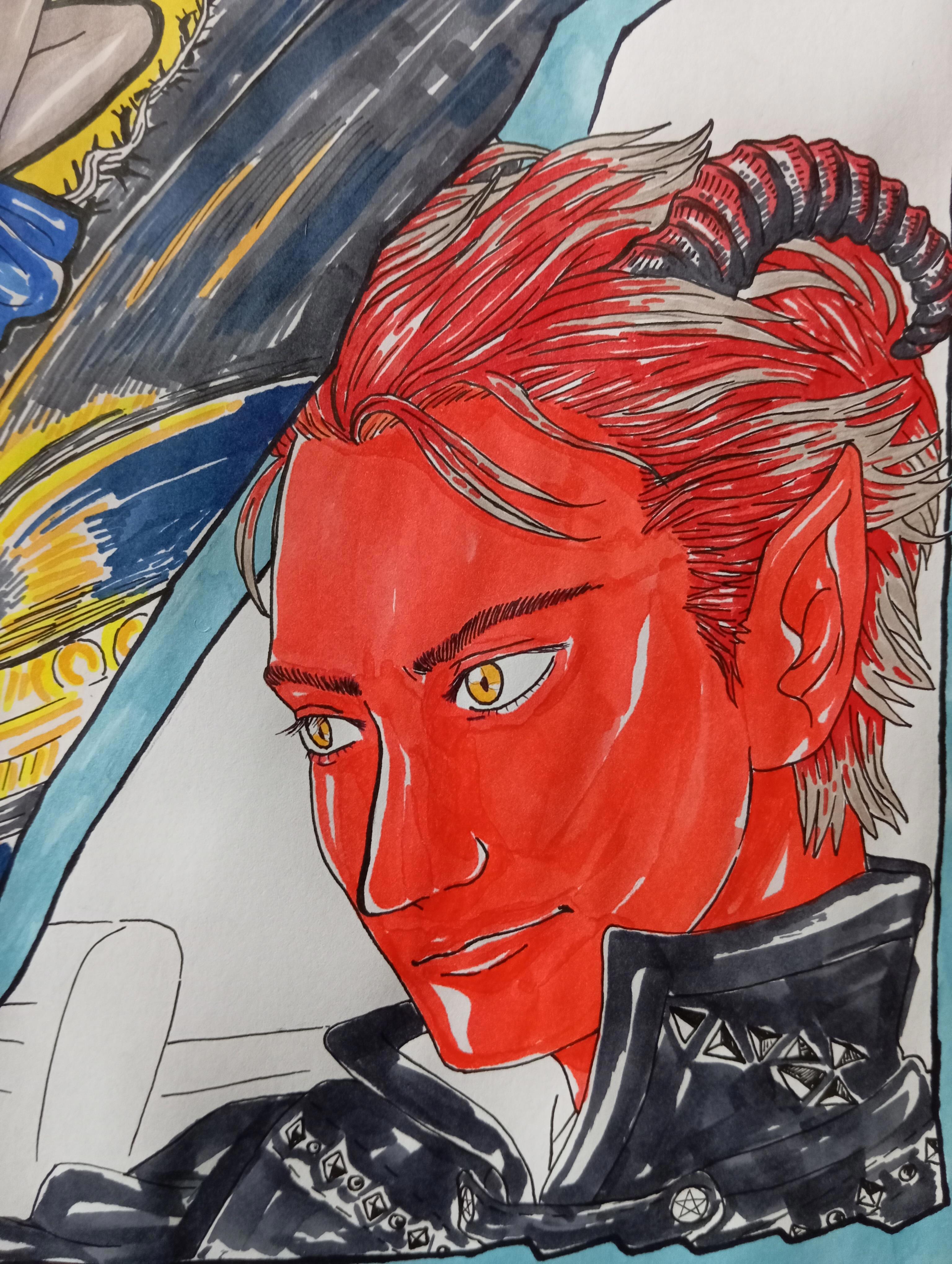 Люцифер-младший - наследный принц Ада, два метра ростом, статный, алая кожа, ярко-желтые кошачьи глаза, витые черные рога, алые волосы с пепельными кончиками. черный кожаный костюм.