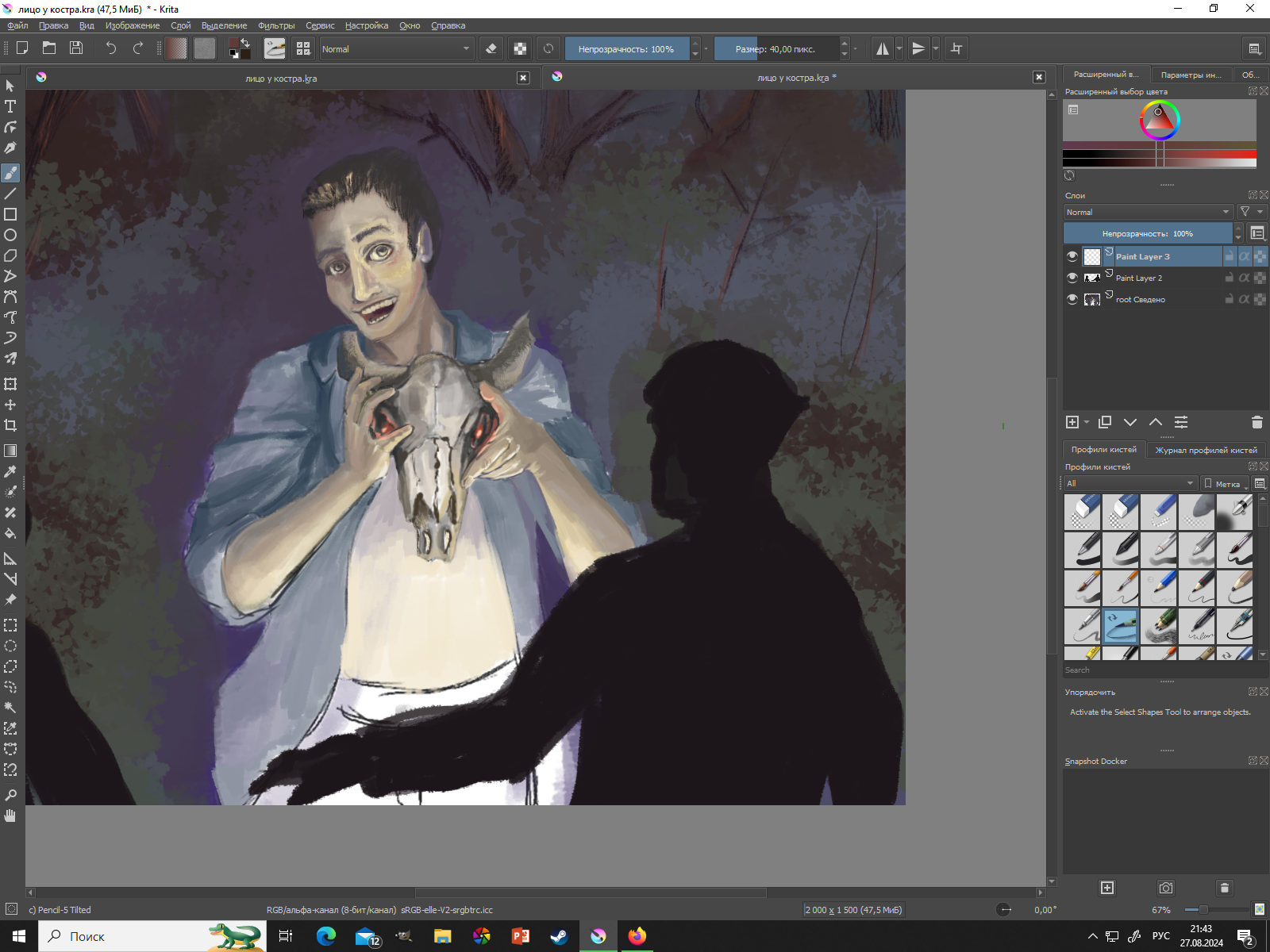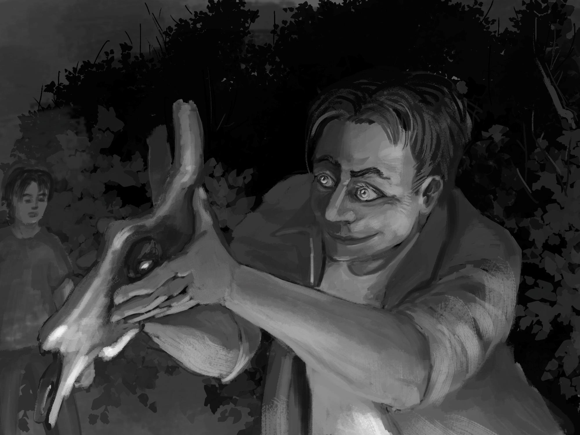 В этот момент раздался невнятный мат и к костру вывалился всклокоченный Толик. Глаза его блуждали, рот скалился в неуместной ухмылке, на вытянутых вниз руках он держал огромный белый череп. В глазницах черепа было намазано углём и лежали подёрнутые пеплом угольки, в них ещё блуждали оранжевые точки огня. Рога были увиты какими-то нитками и ленточками.