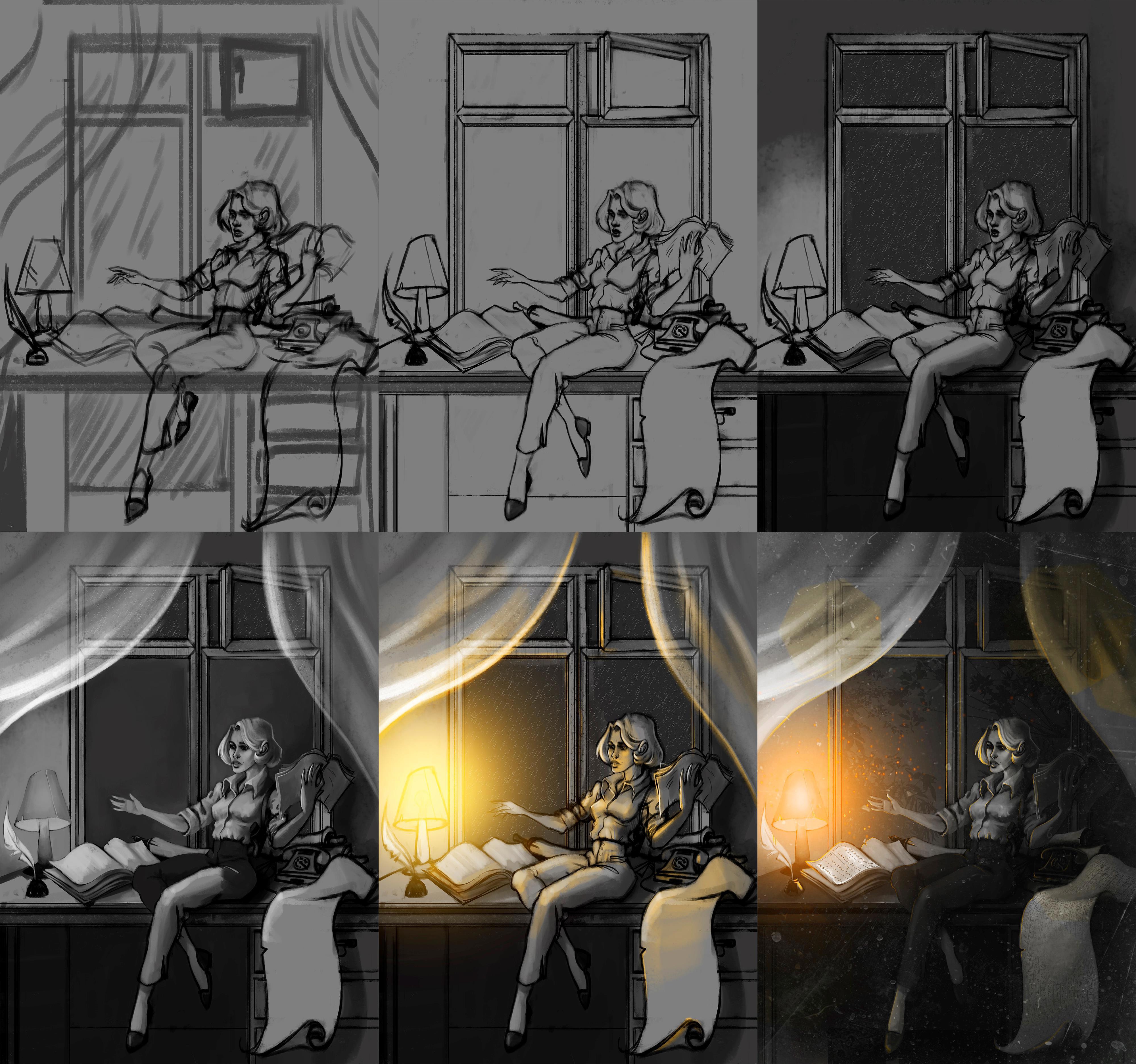 Комментарий: референсом внешности героини является Грейс Келли (короткие и слегка вьющиеся блондинистые волосы, голубые глаза). Одежда - белая рубашка, наплечная кобура, тёмные брюки. Антураж - США 1955 год, нуар. Обстановка - тёмный вытянутый вдоль кабинет, одинокий пустой стол, стоящий у дальней стены, под окном. За окном - дождливая ночь. Единственный источник освещения - настольная лампа. На столе разложены рядком длинные "погребальные египетские ленты" с иероглифами, рядом раскрытый справочник по иероглифике и истории Древнего Египта. Старый бекелитовый телефон.