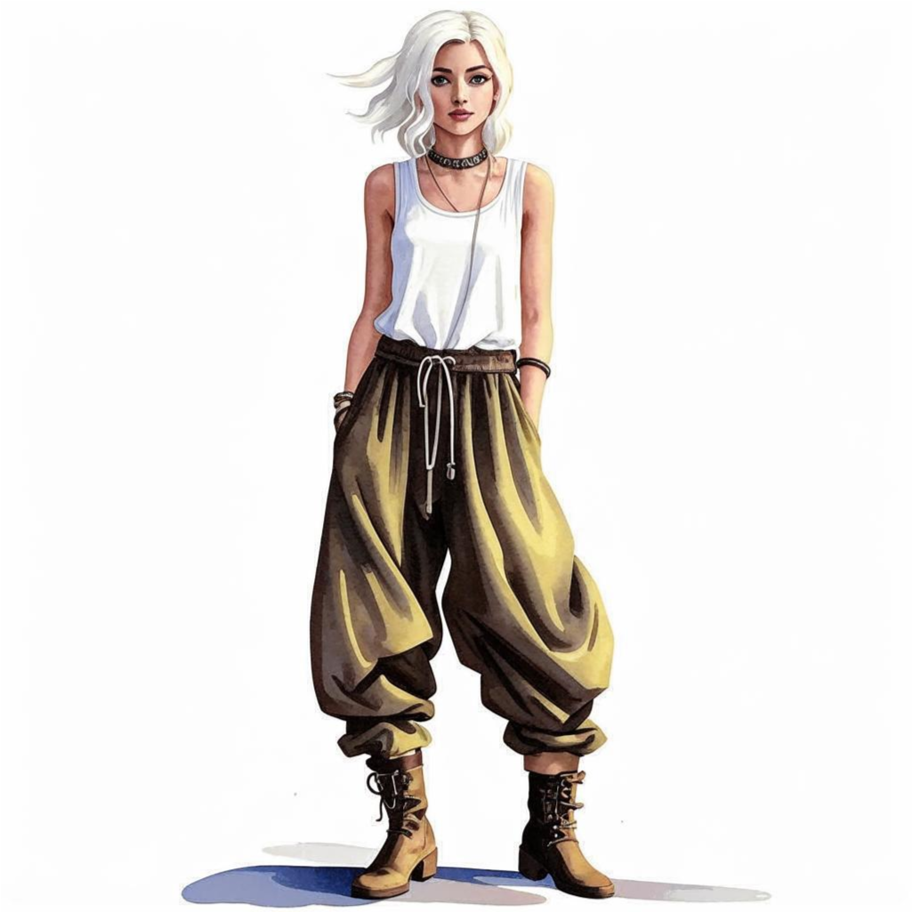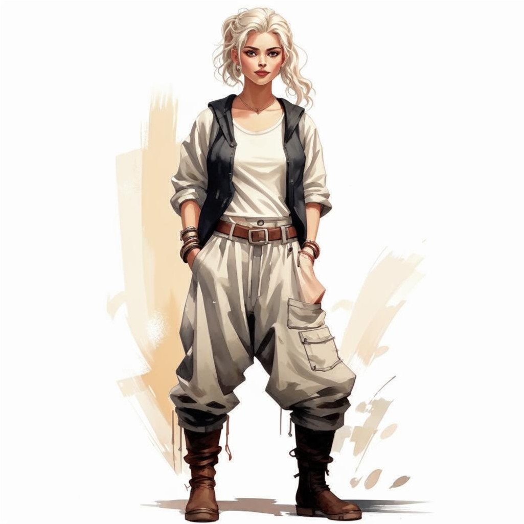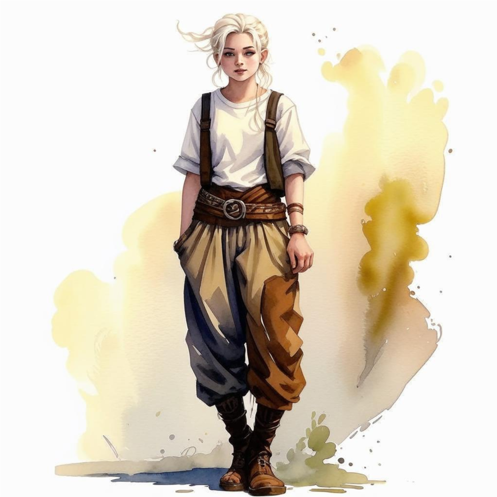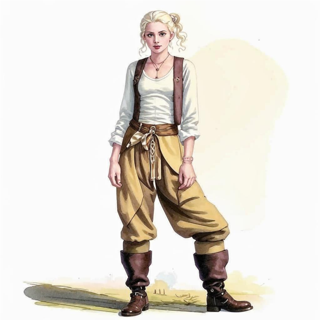 Мягкие грубо сшитые ботинки, штаны широкие из старой юбки — почти шаровары. Рубаха свободная (любой цвет), но с короткой жилеткой для поддержания груди (грудь маленькая!). Волосы белые собраны в хвост. Девушке 16-17 лет.