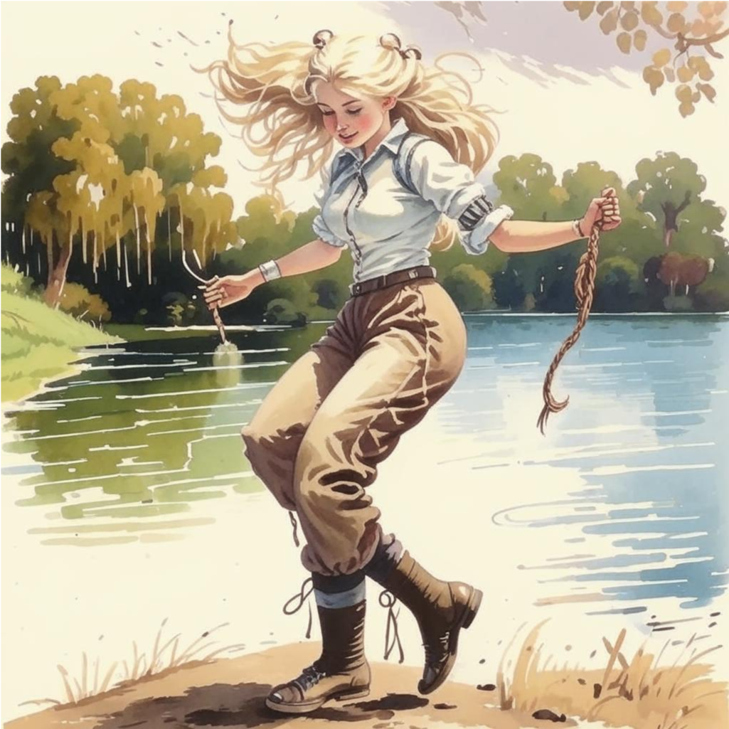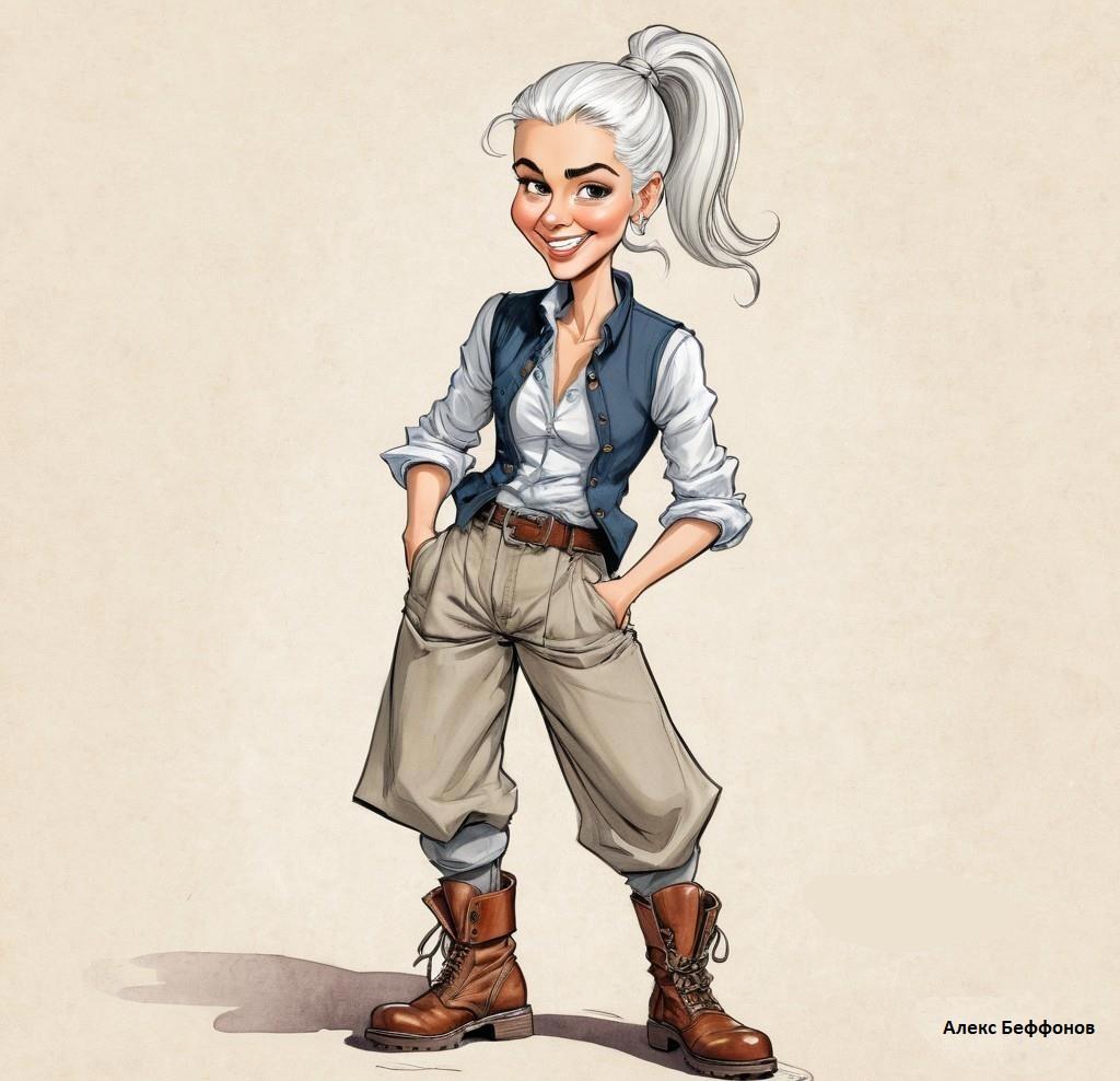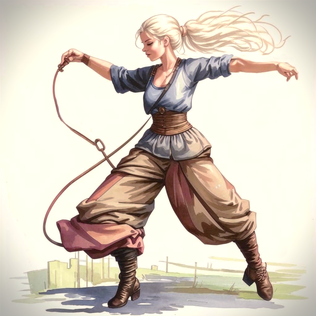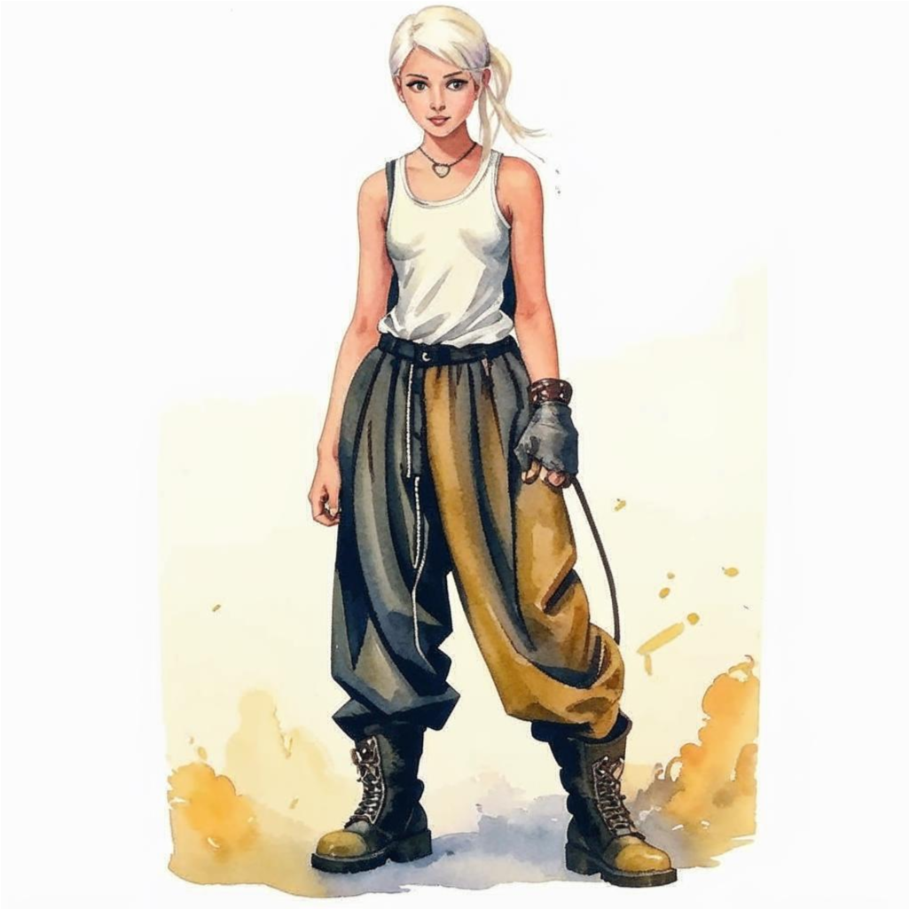 Мягкие грубо сшитые ботинки, штаны широкие из старой юбки — почти шаровары. Рубаха свободная (любой цвет), но с короткой жилеткой для поддержания груди (грудь маленькая!). Волосы белые собраны в хвост. Девушке 16-17 лет.
