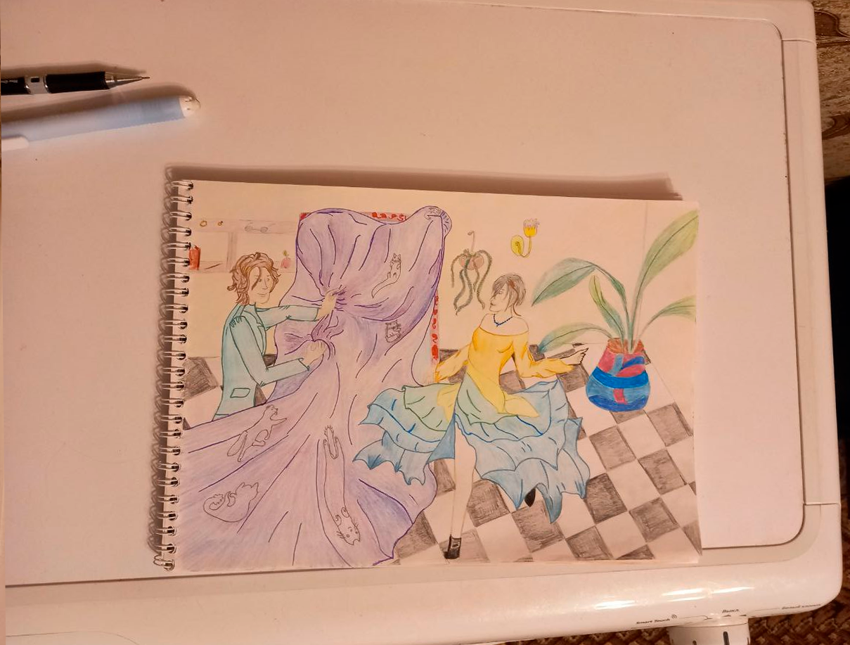 Поскольку нет никаких упоминаний что это за покрывало, какого оно цвета и тд, Манульчик решил украсить его веслыми котятами, ибо мир волшебный и бегающие по покрывалу котики- тоже)