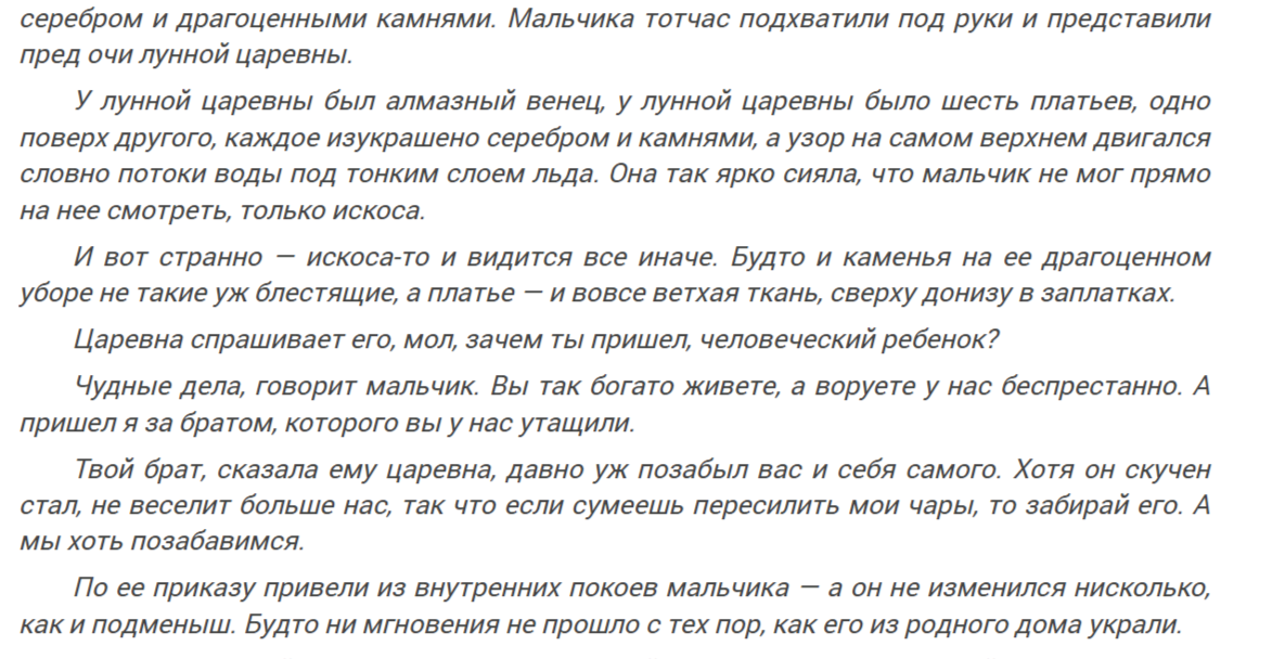 Зато здесь есть шутка. Лунная царевна принадлежит народу "ночных деток" или просто правит ими. Так вот они по приказу своей царевны заменили брата мальчика поленом, а еще, если искоса посмотреть, то вся одежда на царевне превращается в лохмотья. Лохмотья у меня не очень получились, зато получилось показать, что если лунная царевна отвлеклась на секундочку от того, чтобы визулизировать свой богатый трон, он тоже превращается в полено, "украшенное" прибитым на честное подменышеское слово камушком, который нечистики сперли в прошлые свои вылазки.