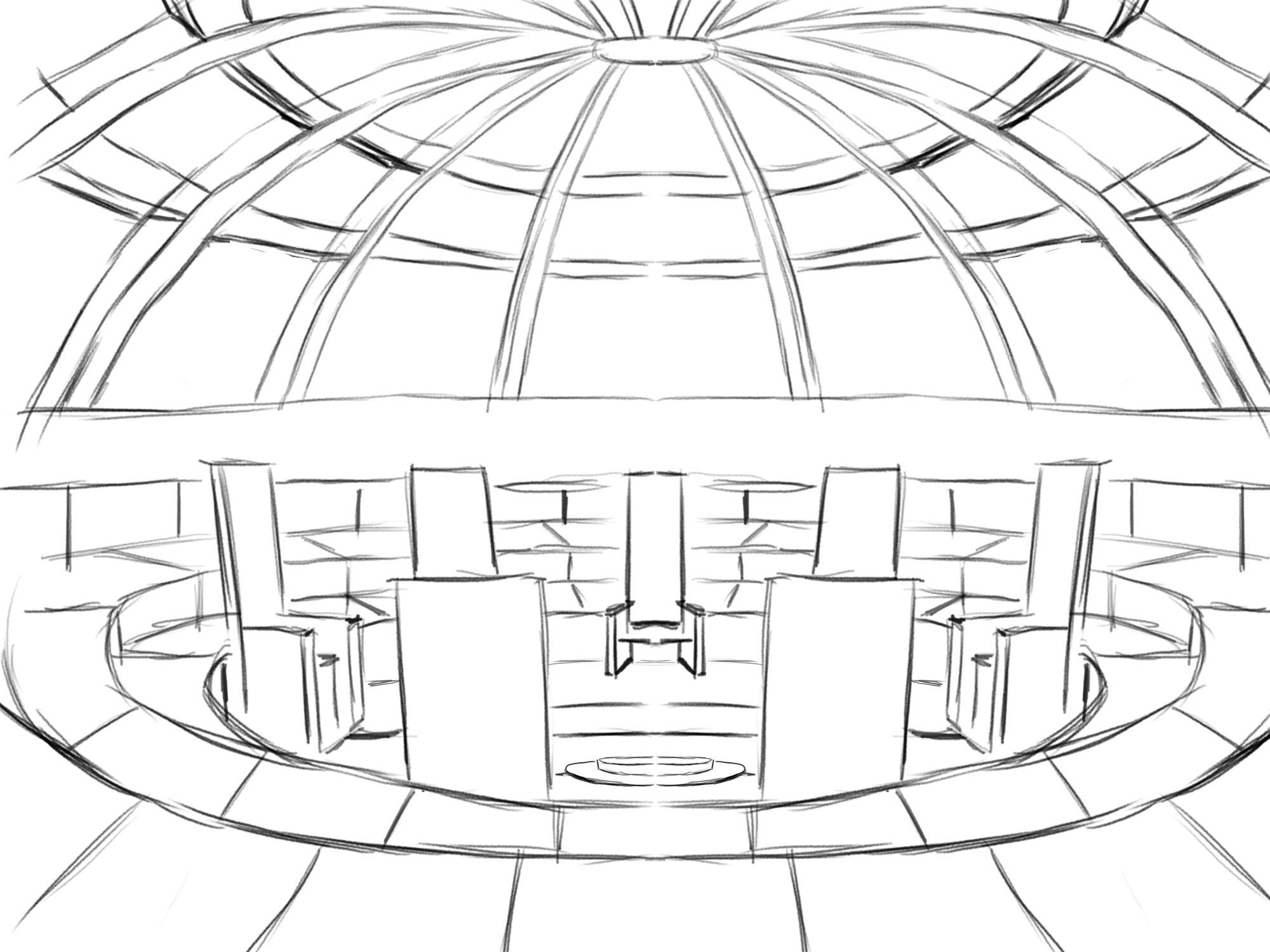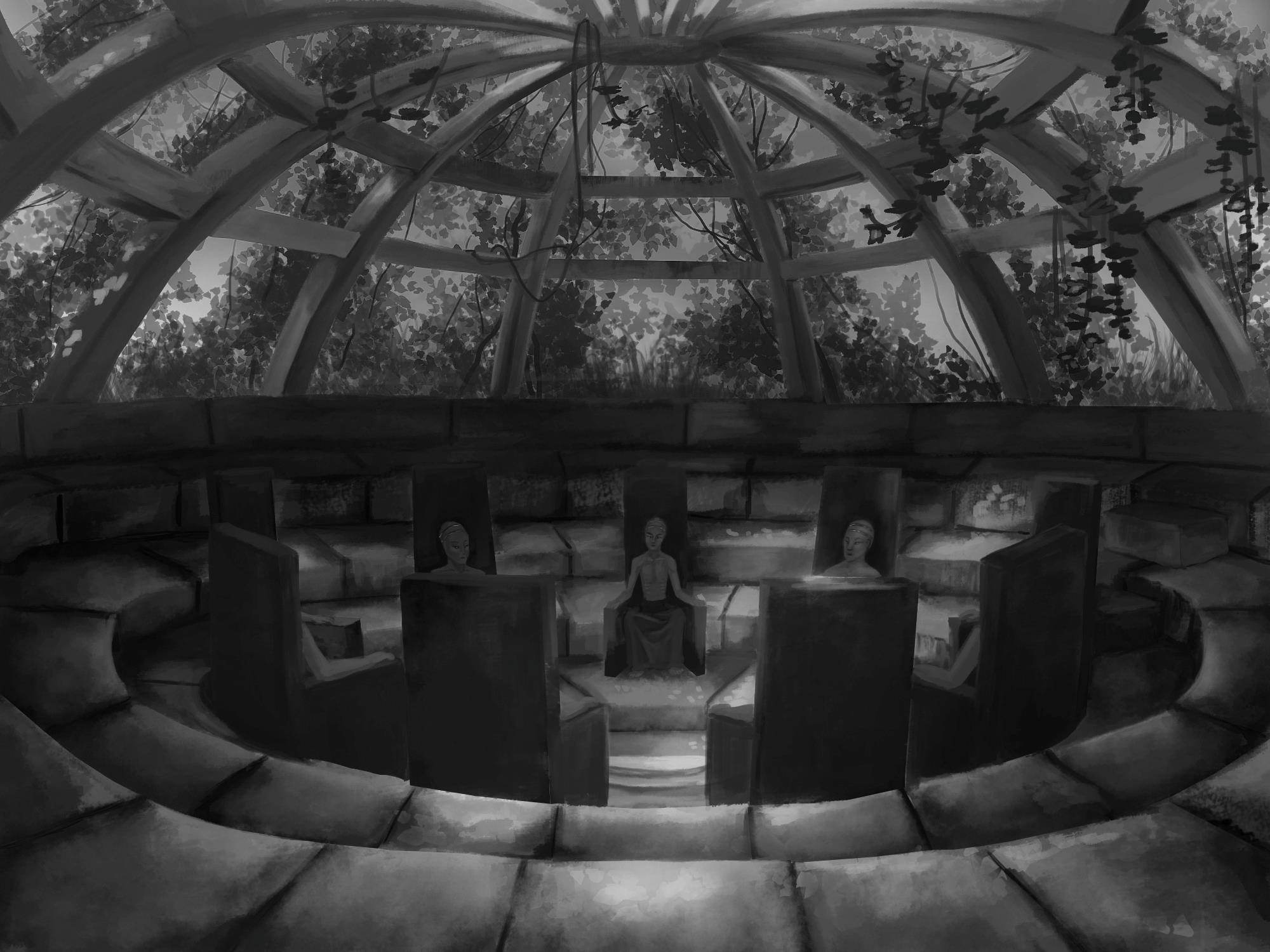 На площадке между двумя ярусами по всему периметру высились базальтовые троны – числом девять. Грубая, топорная работа вызывала диссонанс с ювелирной изящностью прочих деталей амфитеатра. По всей видимости, это было напоминанием восседавшим об их временной участи, и не позволяло впасть в искушение и задержаться на троне дольше положенного.