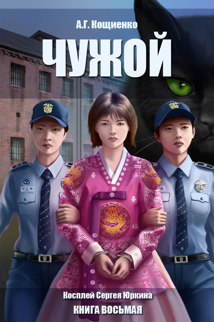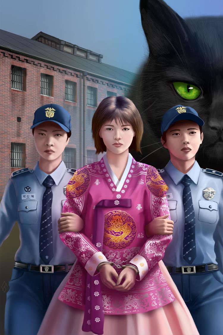 Это опять собирательный образ, так сказать ощущение от прочитанного. ЮнМи в королевском ханбоке с драконами изображает принцессу Чосона - иллюстрация того, как сильно выделяется ЮнМи от остального общества. Стражницы ведут ее под руки в мрачную тюрьму. Самое время пасть духом, но с ЮнМи армейский курс боевых искусств и ее любимая кошка Мульча, которая грозно наблюдает за происходящим и наводит своим присутствием страх и ужас на обитателей тюрьмы.