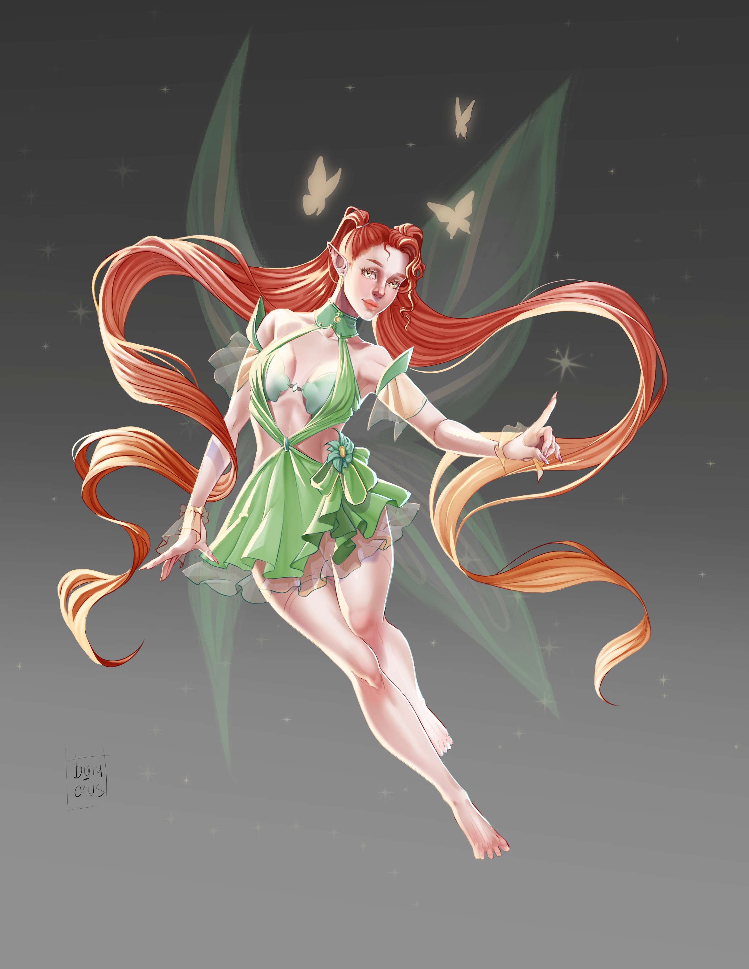Вообще, изначально она планировалась фей, но мне больше симпатизировал ее образ без крыльев, поэтому она осталась без крылой. Это одна их тех работ, когда я работаю и с цветом, и с лайном и объемом. Тяжко, но красиво :)