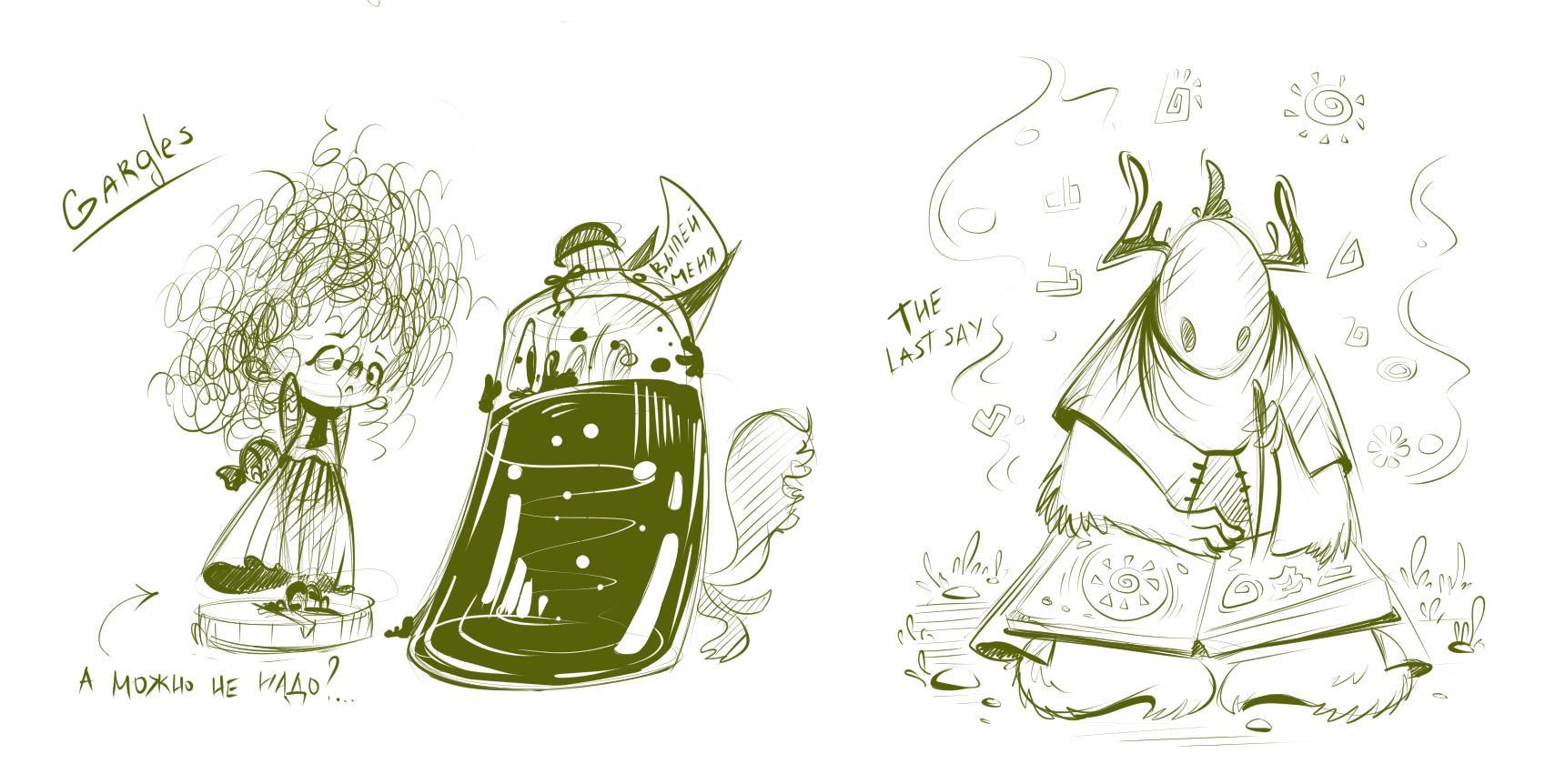 В побочных илльках мы, как обычно, с персонажами экспериментируем с пластикой и динамикой. А в более проработанных — с композицией и фонами