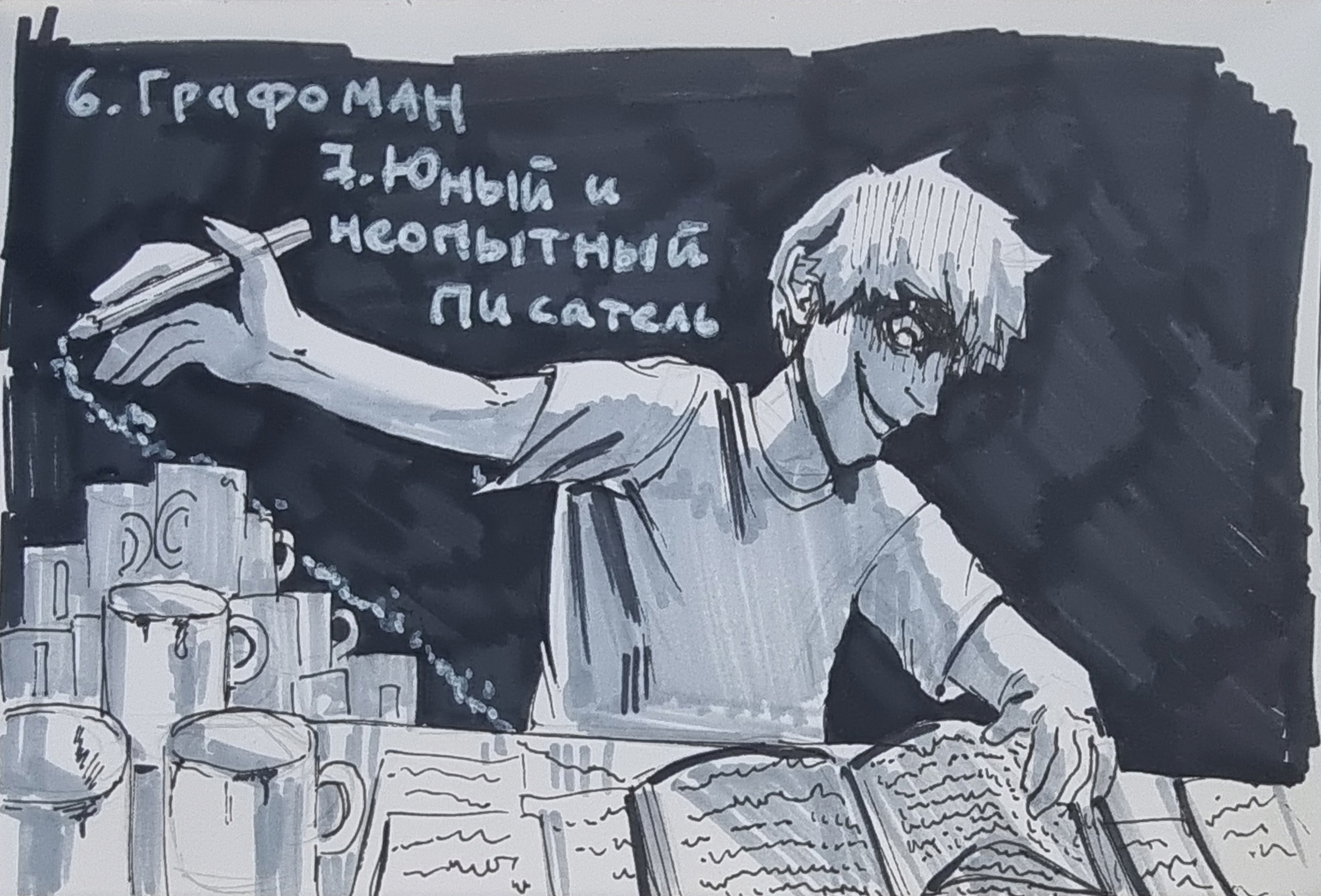 6 и 7 тема АТтября - графоман и юный и неопытный писатель, все темы можно посмотреть здесь: https://author.today/post/549163