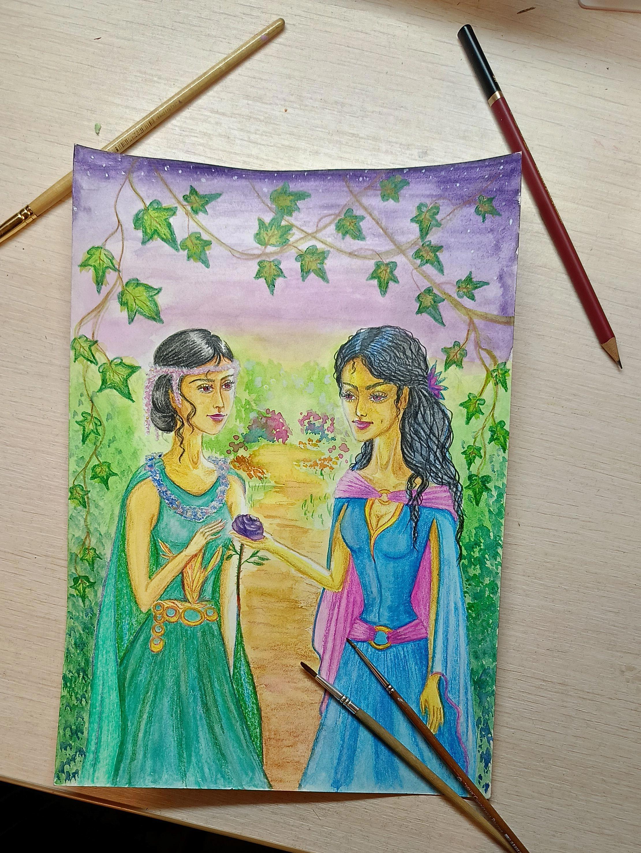Фата Ноча привела сестру в заросшую плющом дальнюю беседку сада. Здесь было темно и безлюдно. Запах окончательно сморил Фата Лету. Тогда злоумышленница сняла с нее обручальную гирлянду и надела на себя. Потом положила сестру на скамейку, повернув лицом к сидению и подсунув розу ей под нос. А сама достала пузырек, с заранее приготовленным зельем, и выпила его, чуть поморщившись. Достала зеркало и убедилась в том, что стала точной копией сестры. С замирающим сердцем Фата Ноча поспешила назад.
