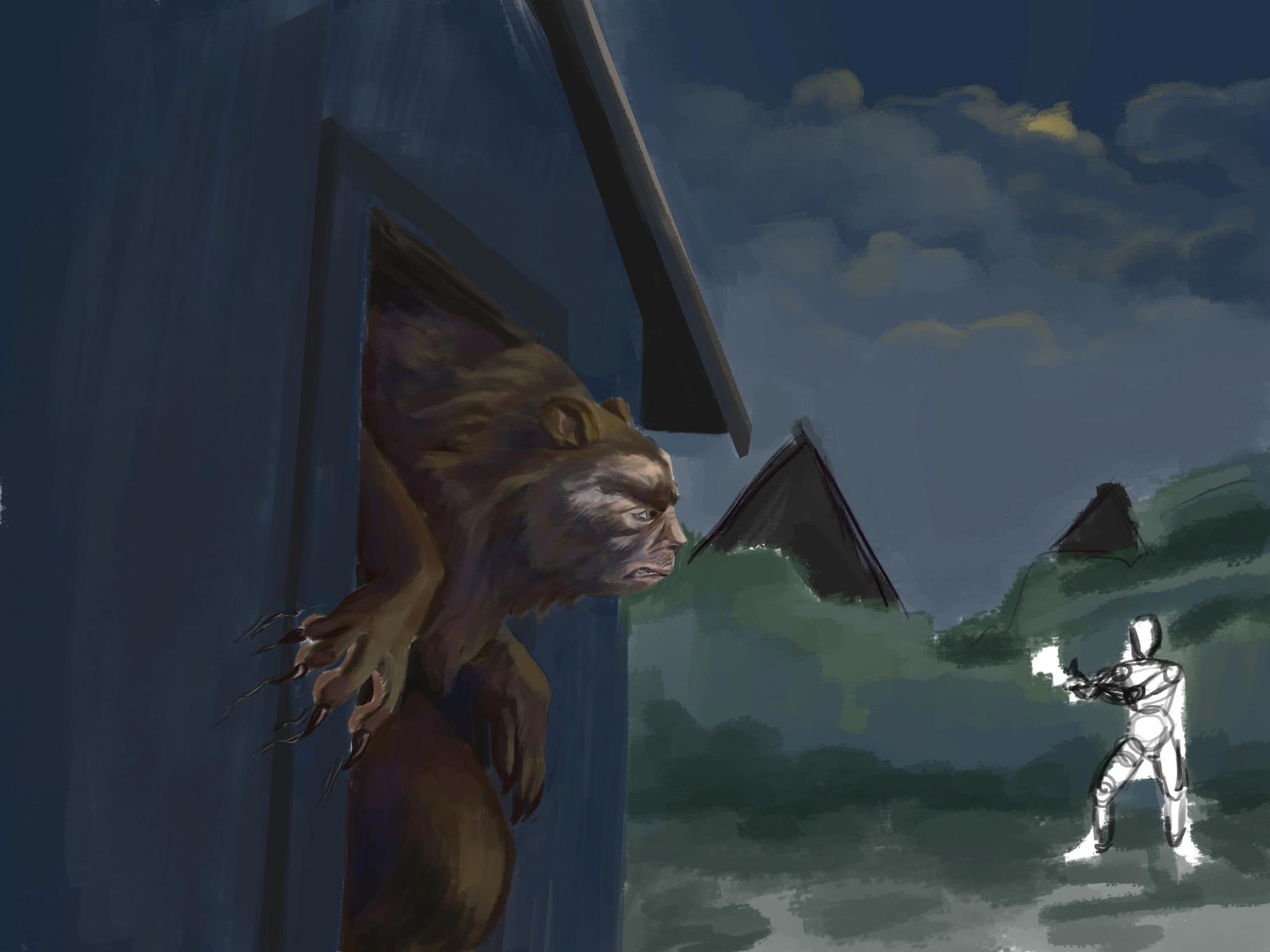 Зверь взвизгивает, пару раз кувыркается, прежде чем становится на лапы. Он тяжело дышит, смотря на меня тяжелым взглядом. Прицеливаюсь, но выстрелить не успеваю. Оборотень в два прыжка скрывается за домиками."