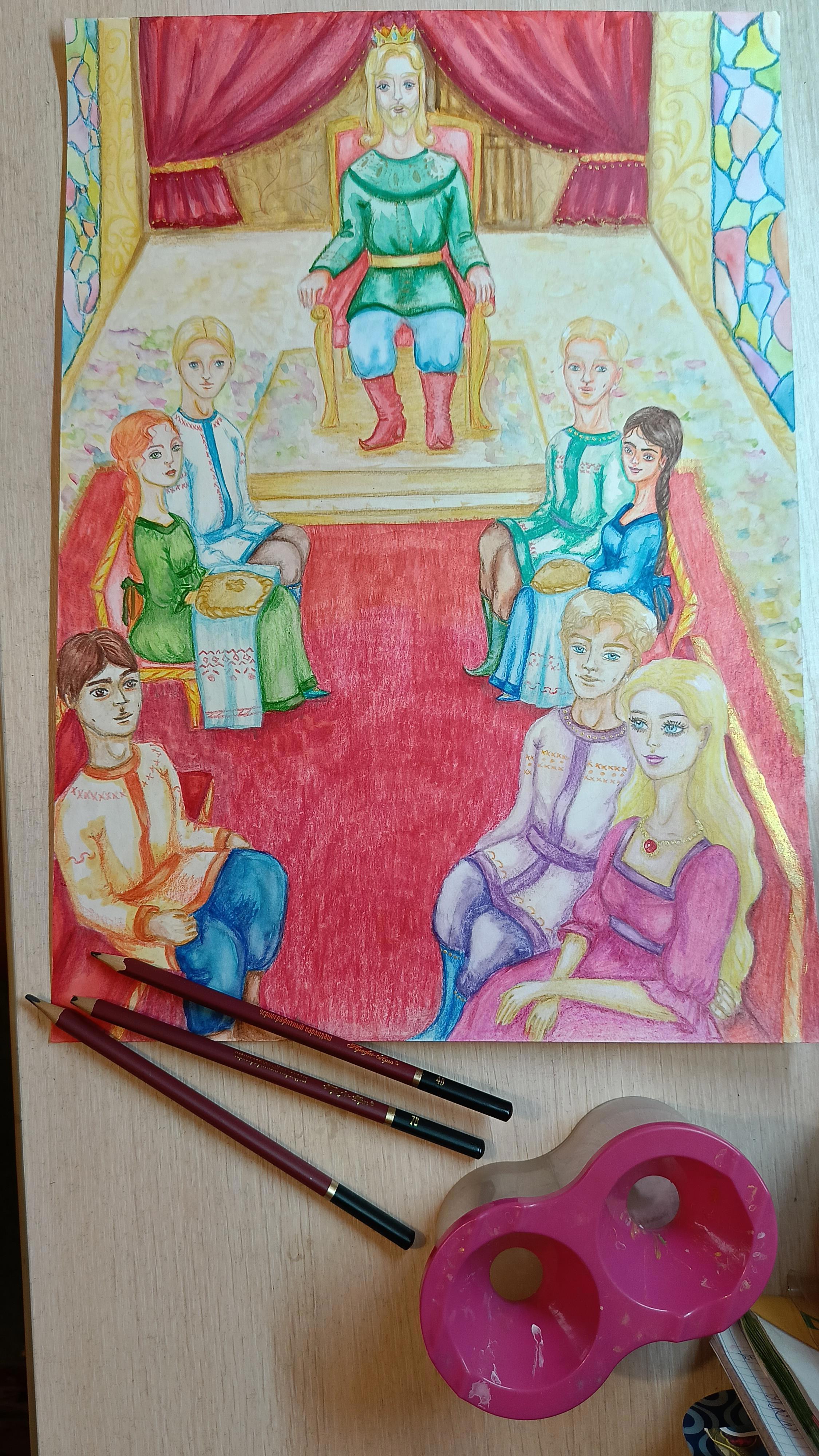 Мои пустые руки не остались не замечены царём. Он бросил на меня разочарованный взгляд, но на этот раз решил начать с других будущих невесток. Девушки подошли к каждому в собрании, в том числе и ко мне, и предложили отщипнуть от караваев.
