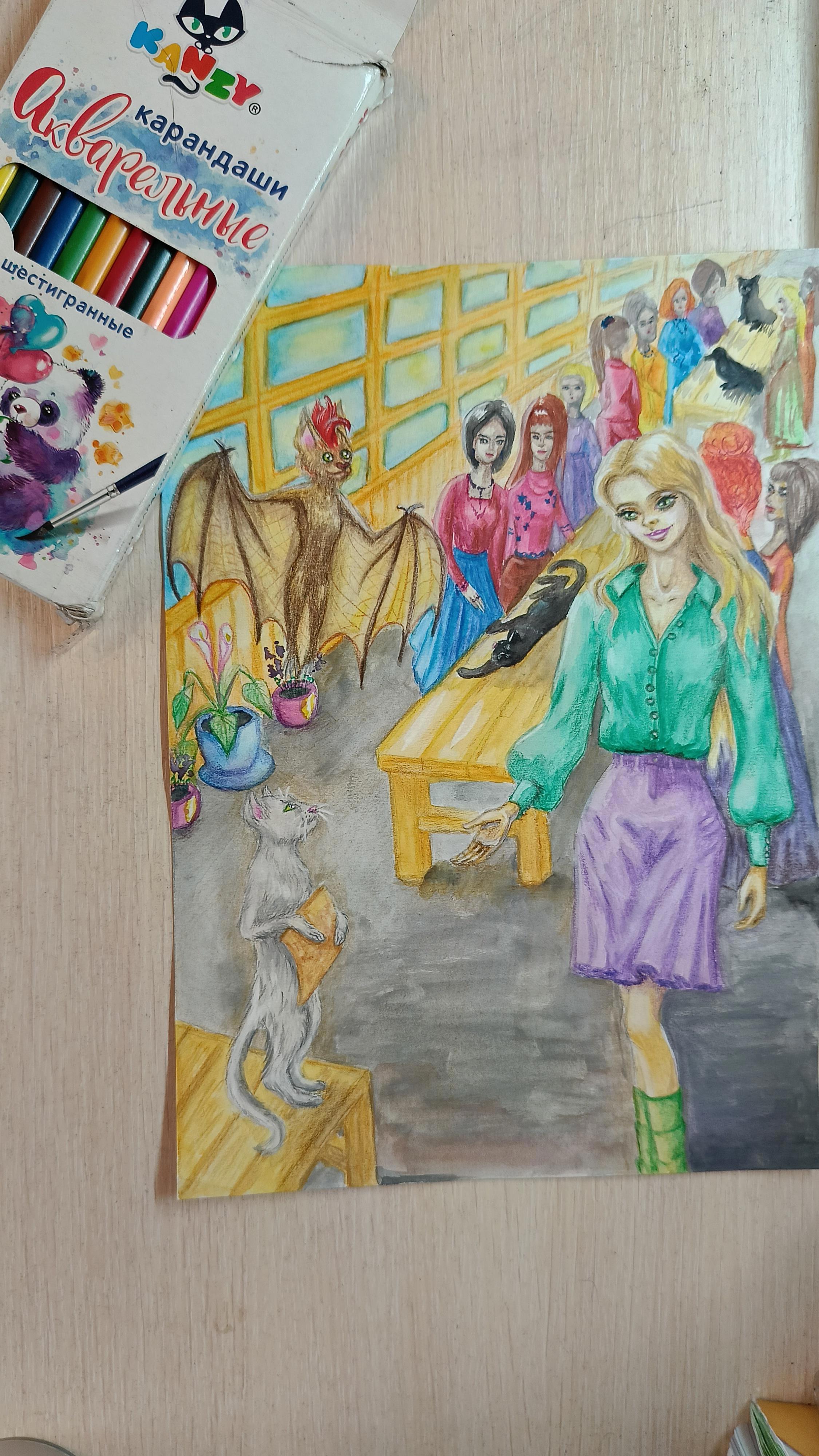 Откуда не возьмись, выпорхнула здоровенная, хотя тоже чрезвычайно тощая летучая мышь. Глаза у мыши были такие же зелёные, как и у кота. А на голове ярко алел настоящий панковский хаер.