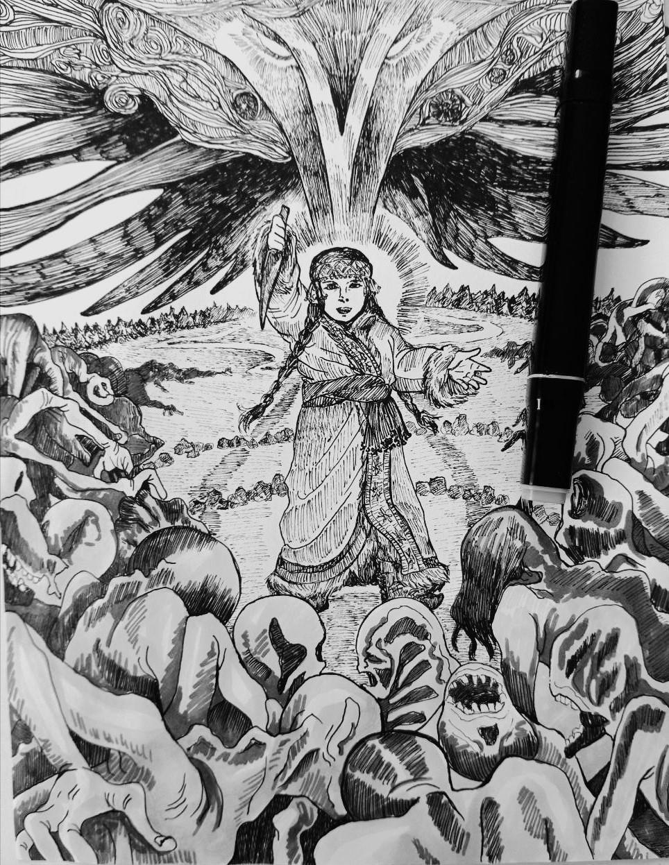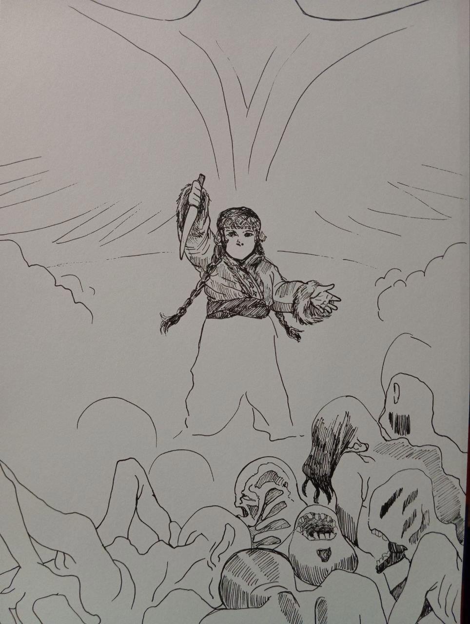 А тут ещё потянуло холодом Нижнего мира — земля людей расступилась, выпуская новых тёмных духов. Завывали, вопили, свистели, неслись над истоптанными снегами, политыми кровью людей. А громче их голосов грохотал новый бубен и разносилась звонкая песня шаманки: