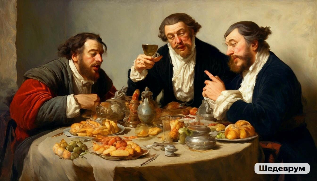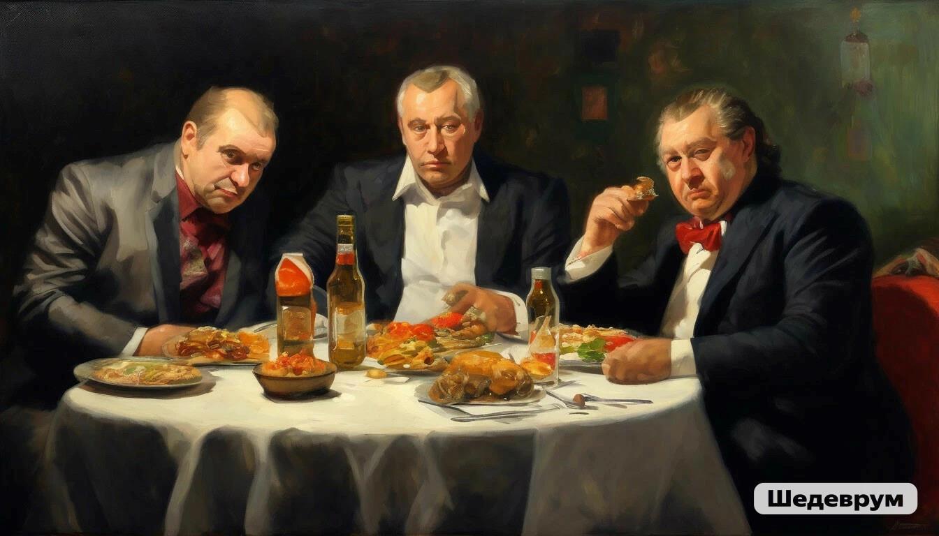 Картина Васи Ницова "Три богатых ряхи" :) Автор: Николай Ионов Это переделка картины Васнецова "Три богатыря" И бонусы🤭 смешно, пародия на живопись, нейросеть, иллюстрация 177 Пожаловаться