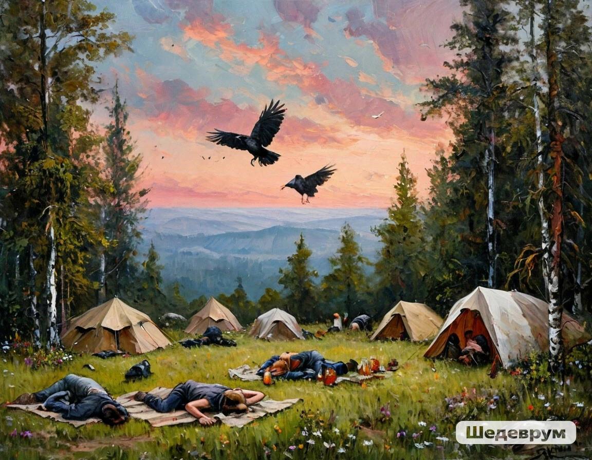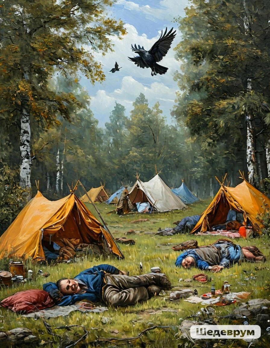 Картина Васи Ницова "После попоища":) Автор: Николай Ионов Допы:) смешно, пародии на картины, нейроарт, нейросеть, иллюстрация 185 Пожаловаться