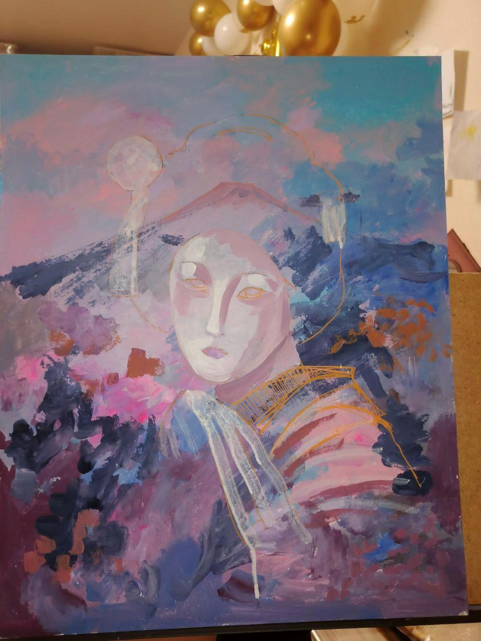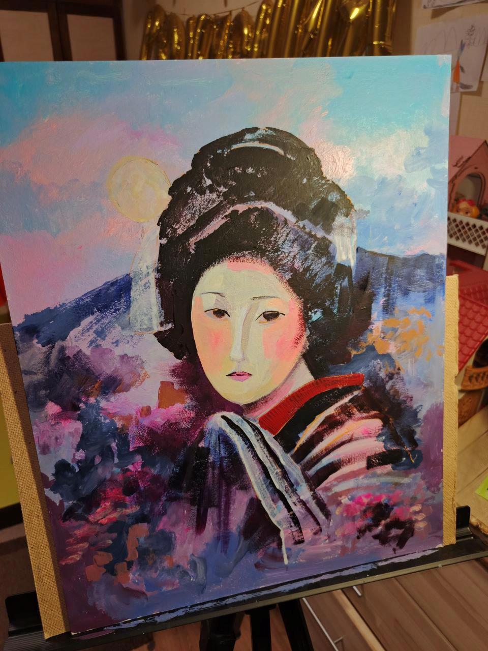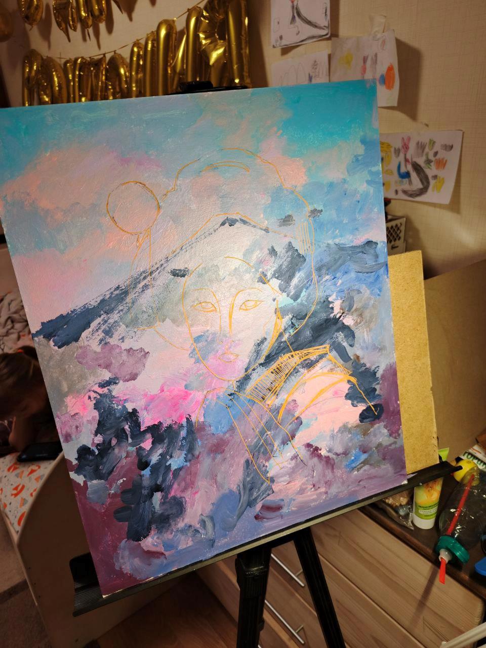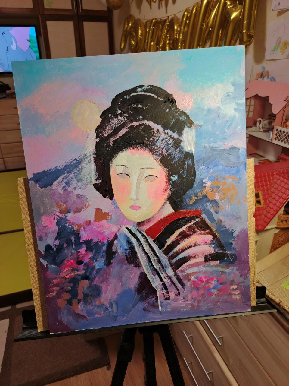 Задумка: объединить одно из старых изображений гейш (которых даже делали на открытки и марки) с горой Фудзи и сделать что-то вроде духа горы, ту самую принцессу, прячущуюся в снегах.