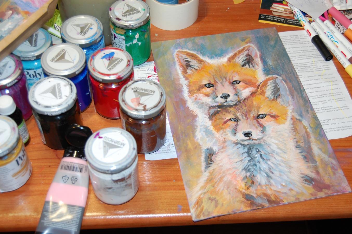 Короче, мучила я мучила свою девушку-Фудзи и решила отвлечься немного. Так что вот, малыши лисята на 20х30см формате (холст на картоне). Акрил.