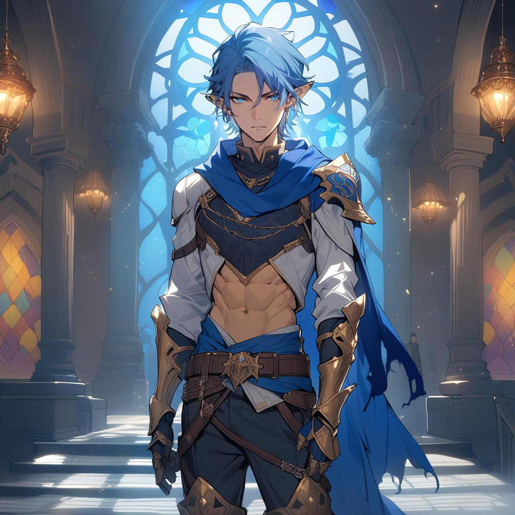 Как оказалось, время было потрачено не зря. Обрывки штанов сменили добротные одежды, смутно напоминающие одеяния магов. Бледно-голубая рубашка, распахнутая у ворота, черные кожаные штаны, высокие сапоги, украшенные ремнями с большими металлическими застежками. Сверху небрежно накинут короткий плащ через одно плечо, украшенный по подолу светло-голубыми перьями с сиреневым переливом. Цепочка удерживала его от того, чтобы сползти окончательно и грохнуться куда-нибудь при малейшем движении.