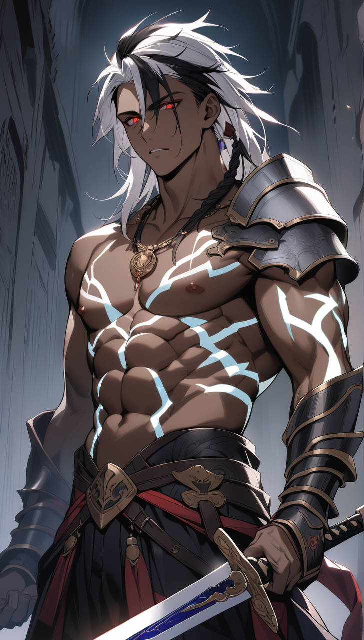 Волосы чуть короче плеч, двухцветные. Белые и черные пряди разной длины, что напоминают иголки. Глаза тоже разноцветные, похожие в одном. В обоих алые искры, которые к костру, горящему в стороне, не имеют никакого отношения.