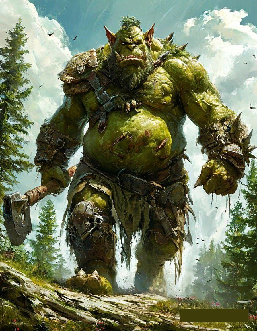 -Как орк. Большой орк, зеленый только. На голове шлем, через плечо доспех стальной. В руках двуручная секира. Большой, массивный, какой-то уродливый и довольно безобразный. Ноги короткие, руки длинные. Лицо в шрамах. Наши монстры по сравнению с ним – красавцы неописуемые.