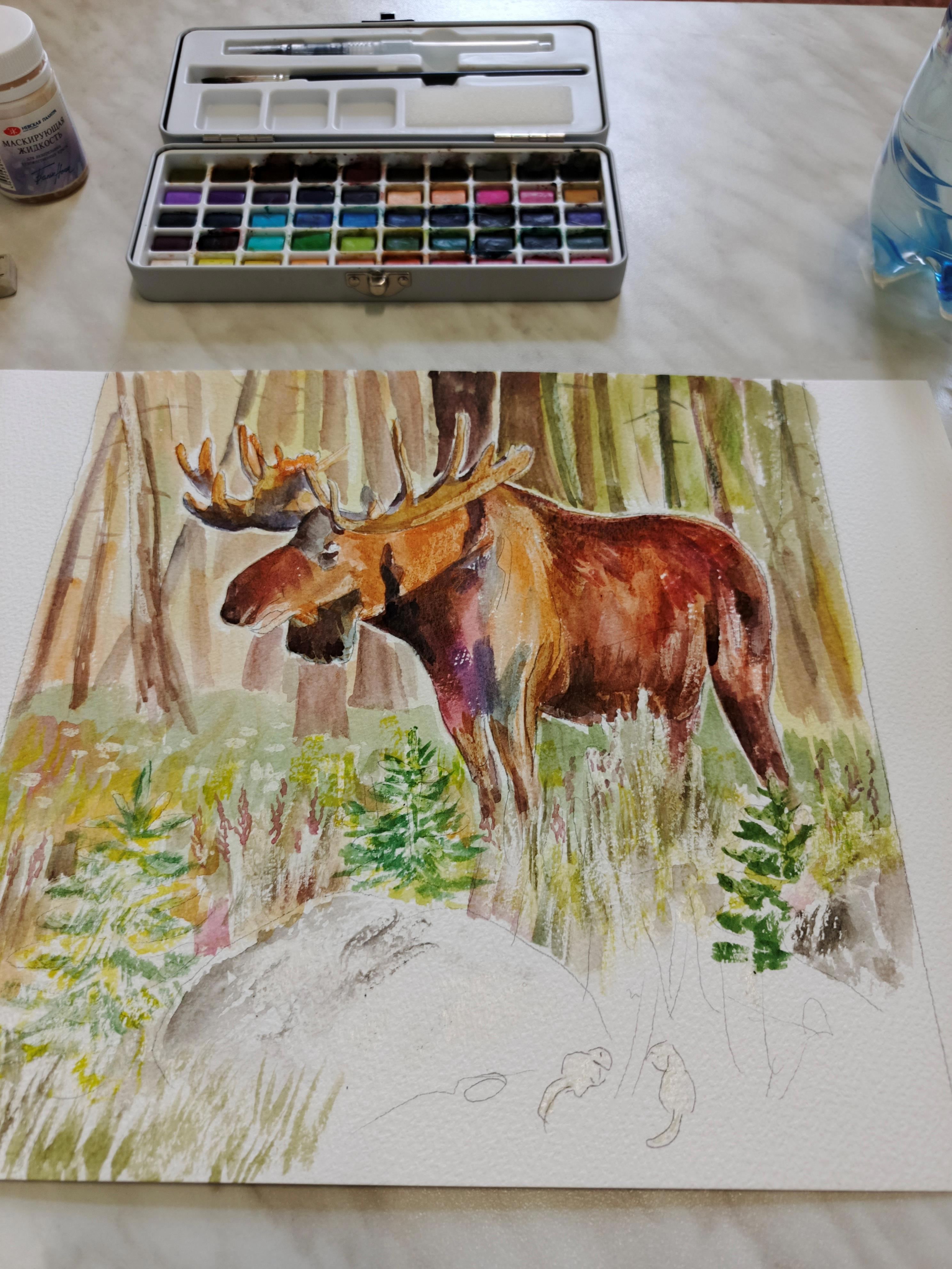 Готовлю иллюстрации для моей книги про медвежонка 3+. Это одна из них. Живописный вышел лосяшь, которого как-то встретил медвежонок в лесу.
