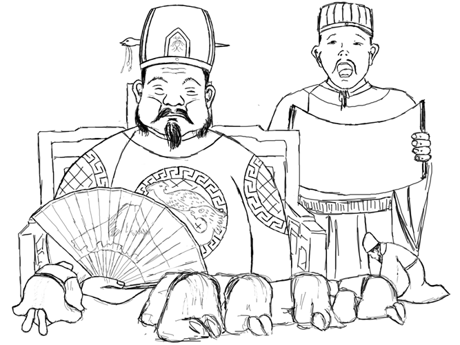 Тао Ханьло согнул руку в локте и качнул указательным пальцем. Я понял, что разговаривать с нами он, похоже, не собирается. Рядом с креслом тут же возник чиновник со свитком в руке.