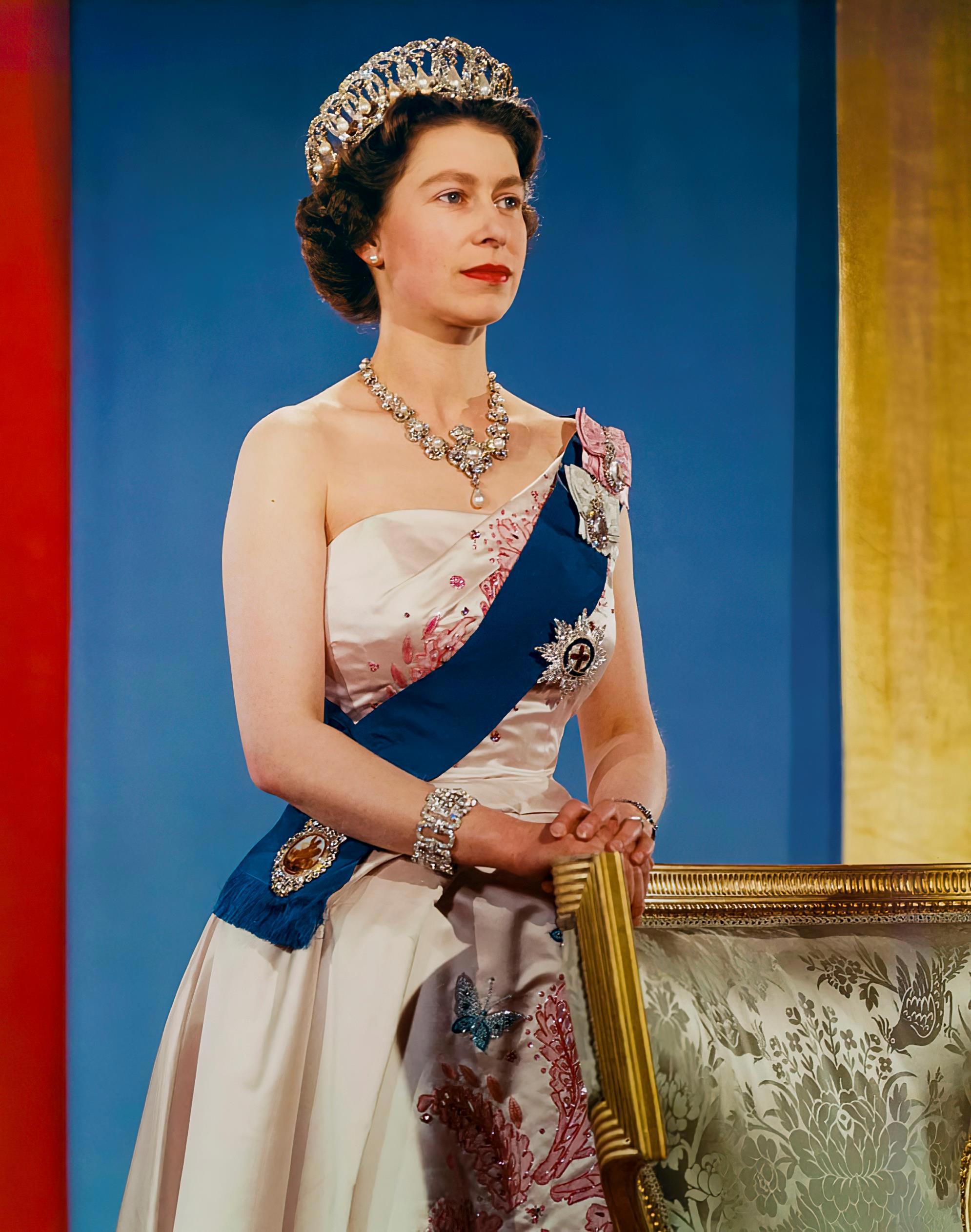 Официальный портрет королевы Елизаветы II перед началом её турне 1959 года, на ней Владимирская тиара, Юбилейное ожерелье королевы Виктории, синяя Лента ордена Подвязки, Значок и Звезда ордена Подвязки, а также Ордена королевской семьи короля Георга V и короля Георга VI.