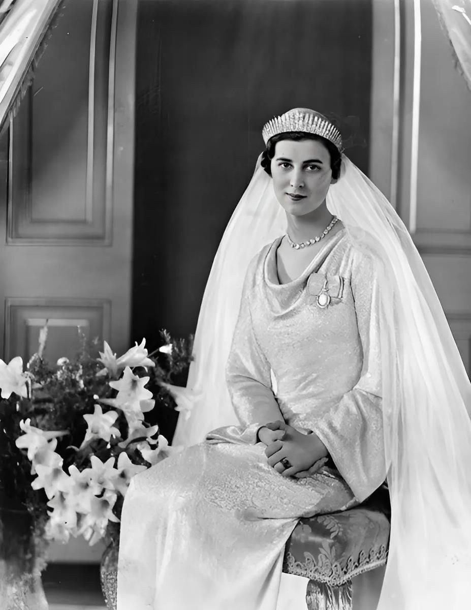 Принцесса Греческая и Датская Марина, герцогиня Кентская в день своей свадьбы 29 ноября 1934 г. На принцессе надета диадема «Владимирская бахрома» – ещё одно знаменитое Романовское украшение, одолженное по случаю торжества у Елены Владимировны. (О ней см. в моих изображениях: «Владимирская бахрома»).