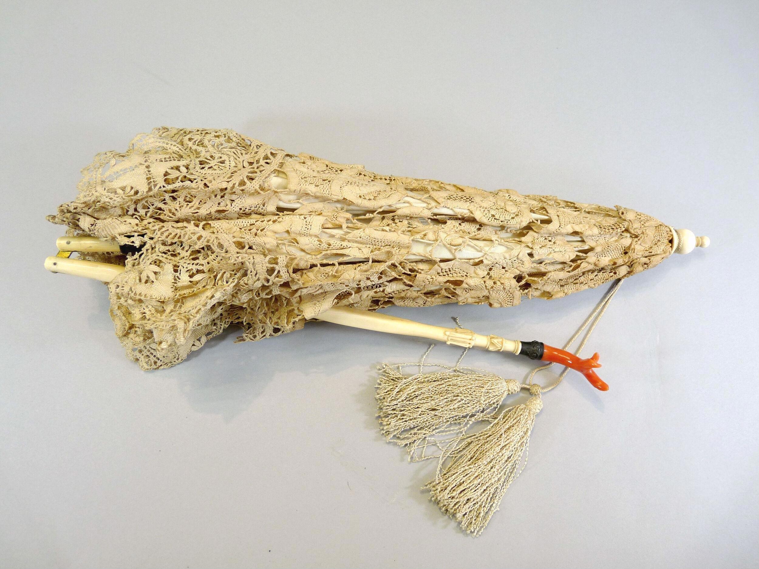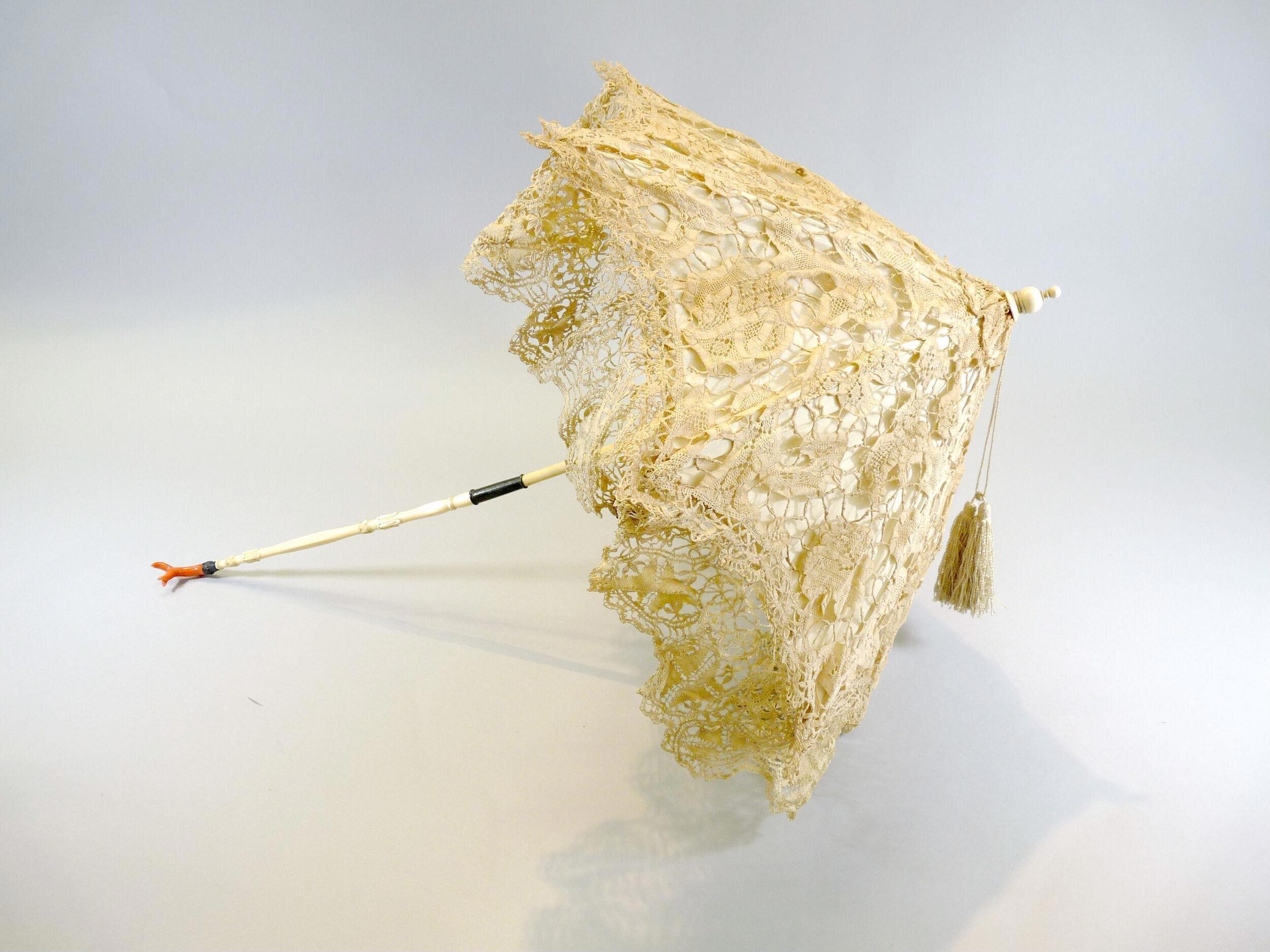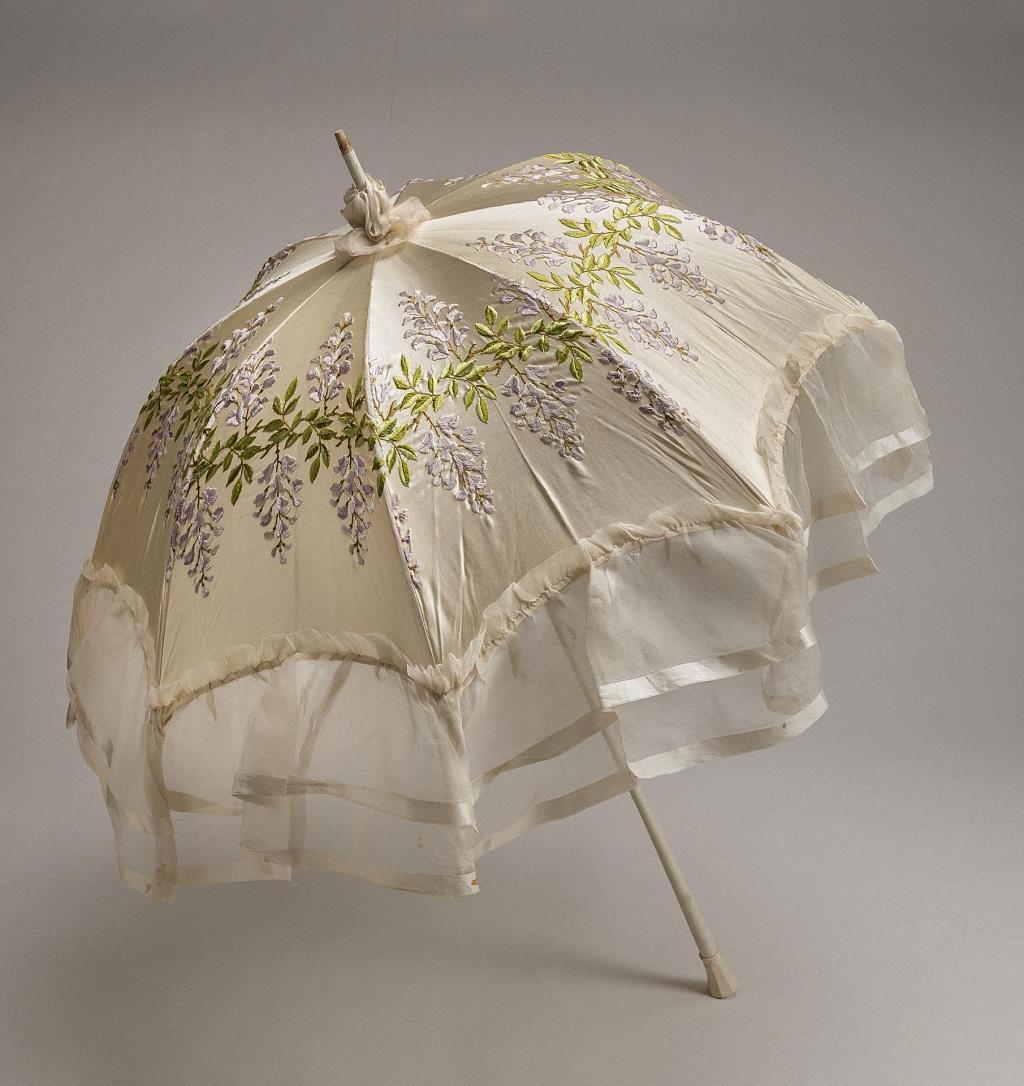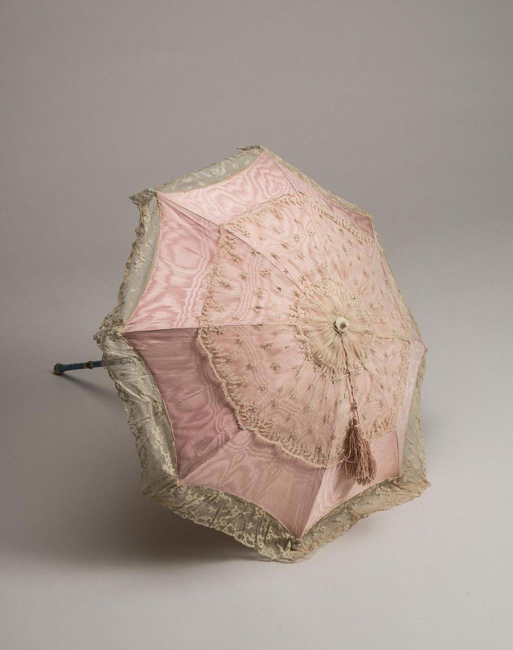 Парасоль из белого ребристого шёлка, покрытый английским ленточным кружевом и мальтийским шёлковым кружевом. Рукоять из резной слоновой кости с шарнирным соединением, позволяющим складывать её до половины длины. Рукоять заканчивается серебряным кольцом и наконечником из натурального красного коралла. 1830-1870. Музей Виктории и Альберта. Лондон.