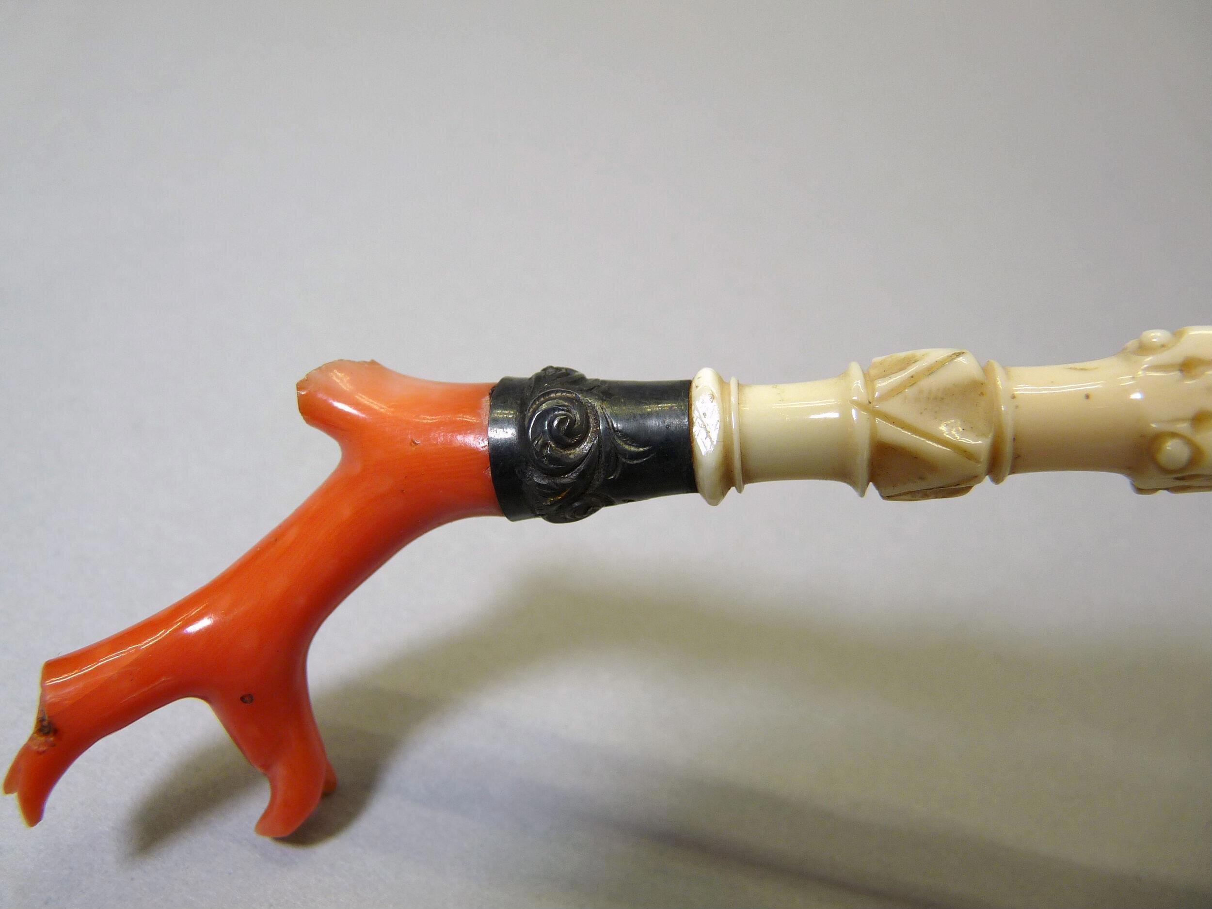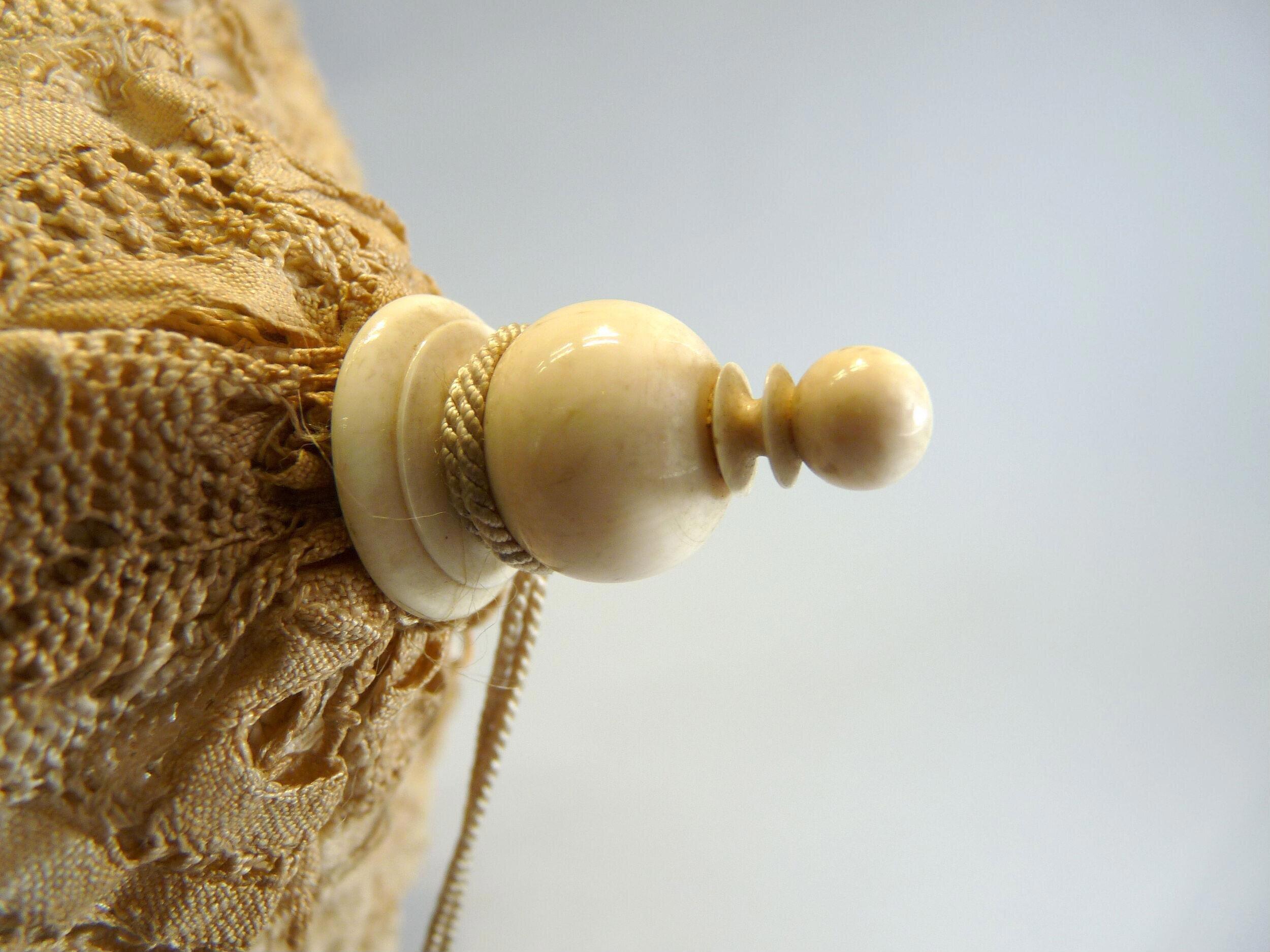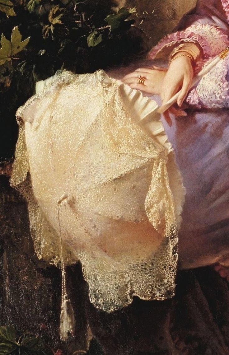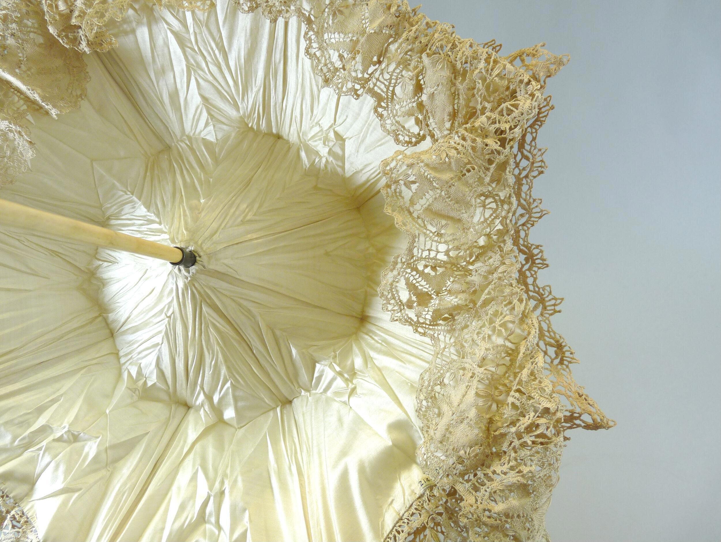 Парасоль из белого ребристого шёлка, покрытый английским ленточным кружевом и мальтийским шёлковым кружевом. Рукоять из резной слоновой кости с шарнирным соединением, позволяющим складывать её до половины длины. Рукоять заканчивается серебряным кольцом и наконечником из натурального красного коралла. 1830-1870. Музей Виктории и Альберта. Лондон.