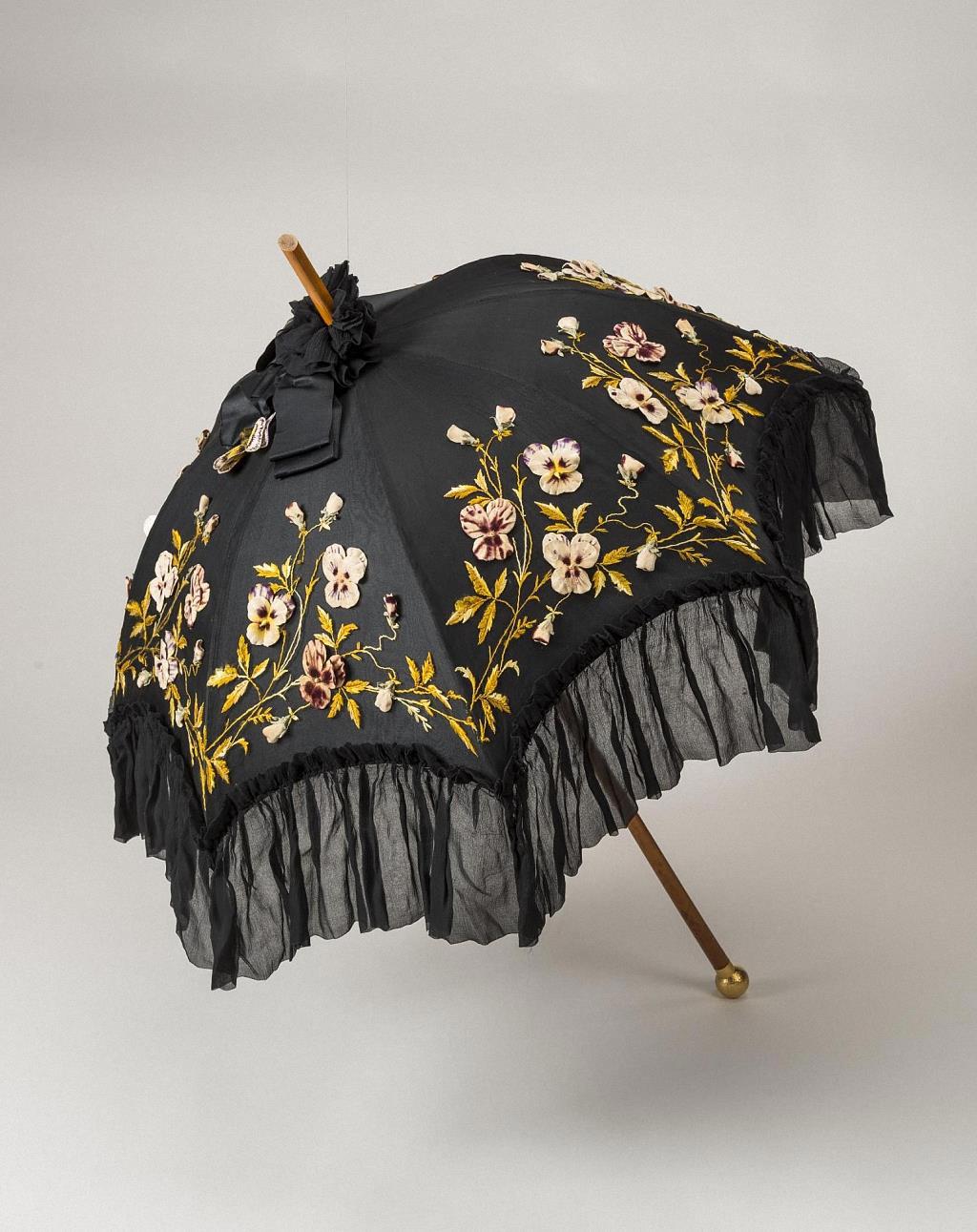 Франция, 1890–1900-е. Фирма «Cazal». Чёрный газ на бархатном чехле, бархатная кайма, аппликация из шёлковой нити, атласная лента. Рукоять из дерева, лак, медный наконечник. Государственный Эрмитаж. Санкт-Петербург.