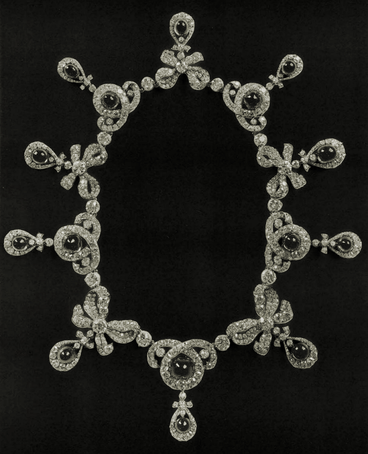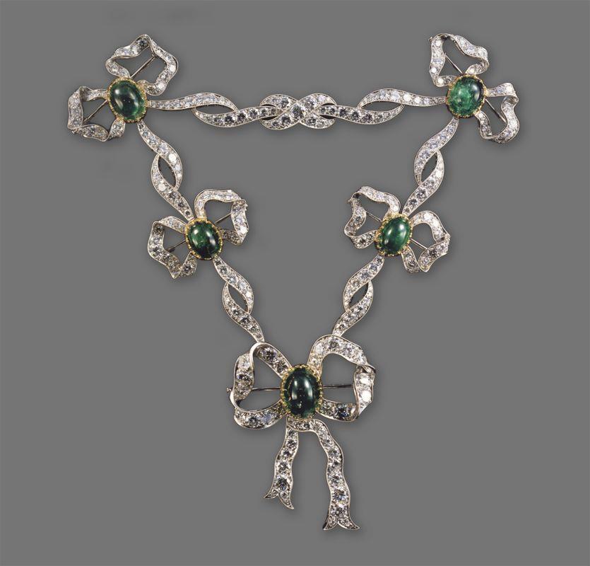 В ожерелье Роберт Шван (Швеи) чередовались алмазные петли и бантики, дополненные каплевидными подвесками своеобразной подковкой окружающими изумрудные кабошоны.